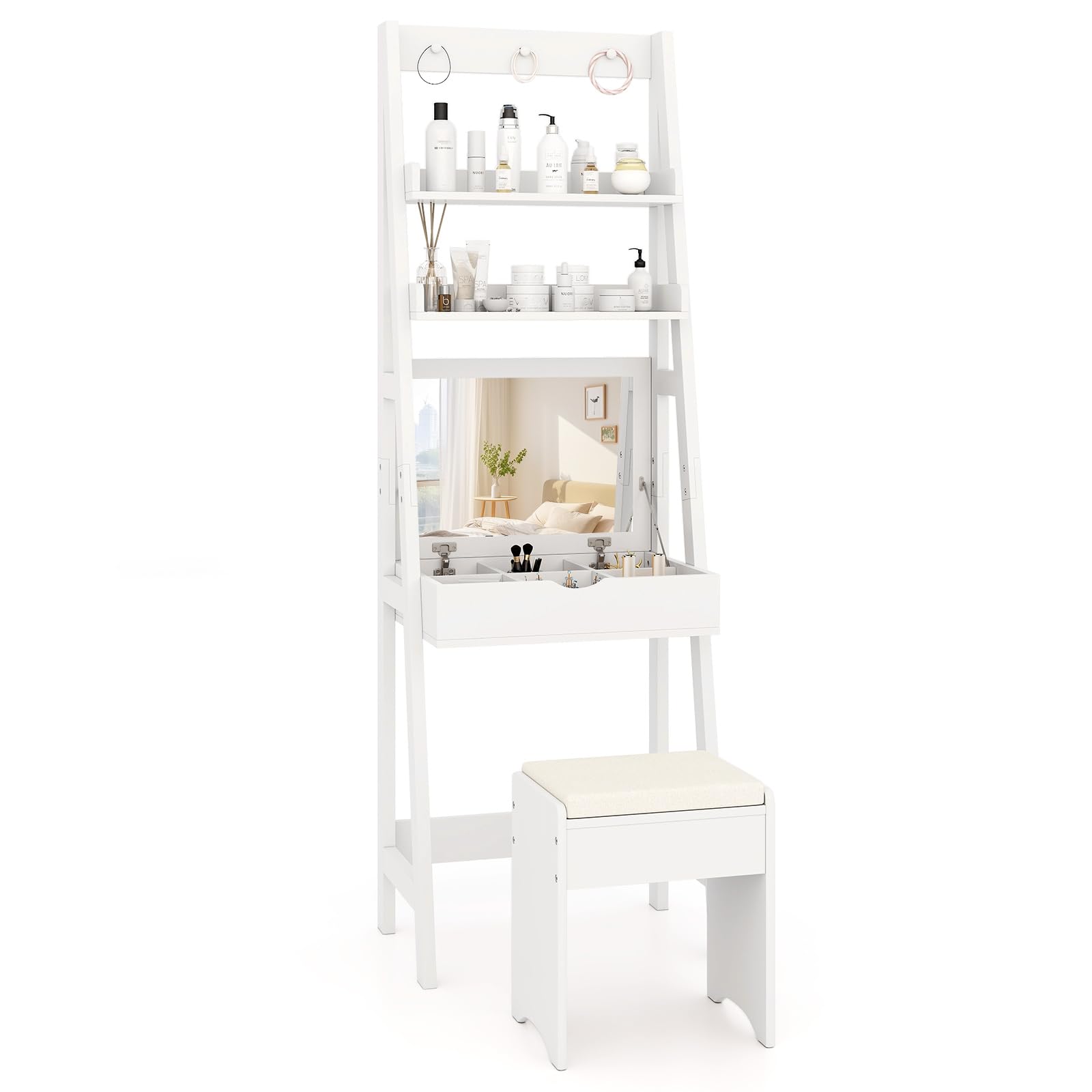 Vanity desk set with flip top mirror and hooks