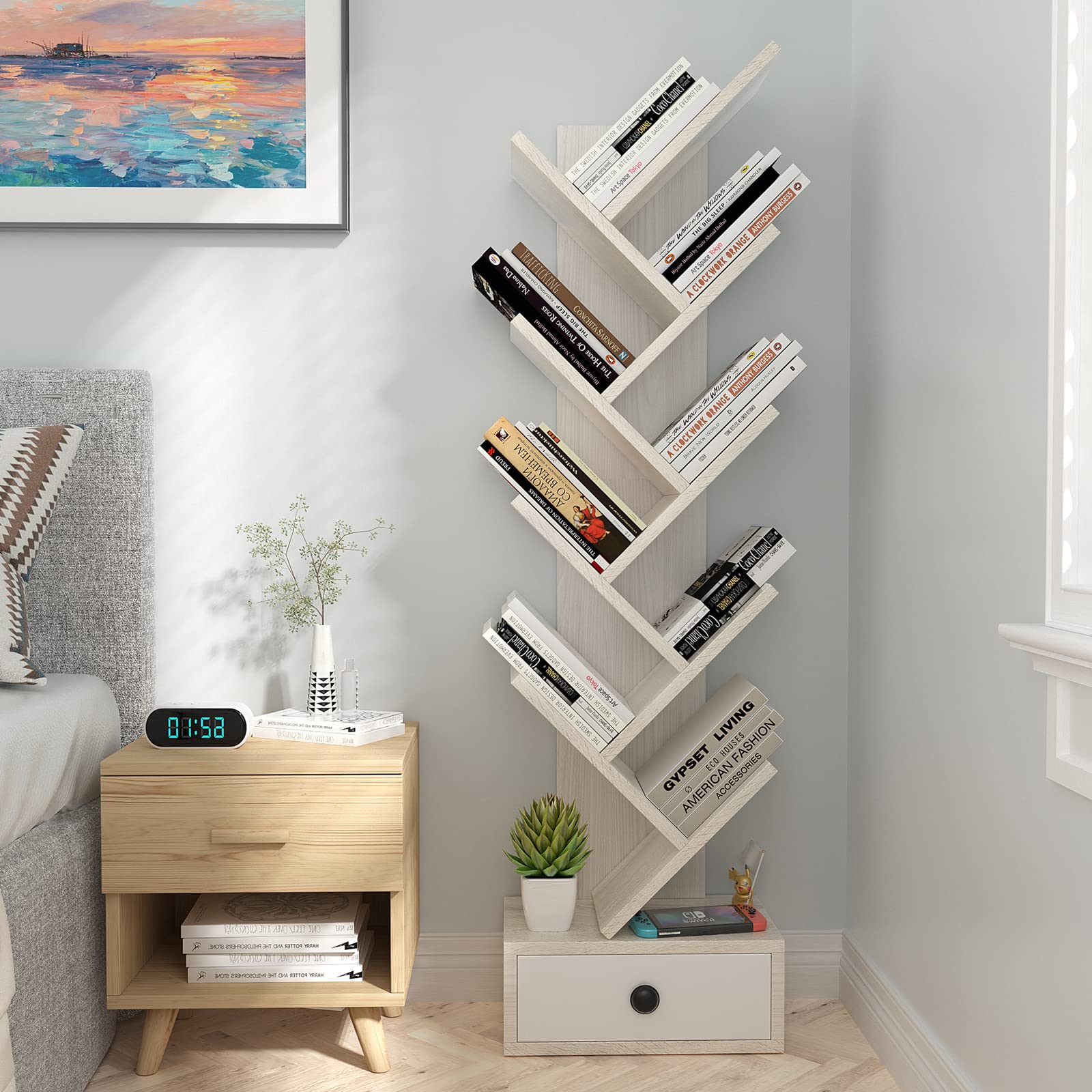 Adequate Storage Space: Now get rid of messy book collections. The tree bookcase is designed with 10 wide shelves in total, you can stack 5-10 books based on different classification rules on each shelf. More, there is a pull-out drawer, 31 x 16 x 12.5 cm (L x W x H), at the bottom, allowing you to gain privacy for important wallets.