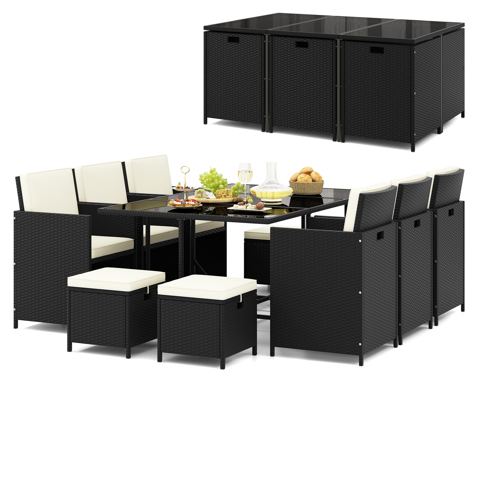 When not in use, the 11 pcs patio dining set can be quickly transformed into a space-saving state within 2 steps.(STEP 1: Put the backrest of the chair down; STEP 2: Put the cushion on the back and put the ottoman under the seat.) Featuring breathable rattan material, the outdoor furniture set provides comfort for all your outdoor events. And the PE rattan is non-fading for long lifespan. For improved comfort, the wicker chairs are equipped with slanted backrests and armrests for upgraded relaxation. And there are stools to rest your legs. The chairs are supported by cross metal pipes for added load-bearing. Besides, the dining table with metal legs and adjustable foot pads will enhance stability. Moreover, you can enjoy a luxurious seating experience with our sponge-filled cushions and pillows that provide added comfort. Whether you have a garden, yard, patio, or poolside area, our wicker conversation set is a versatile and stylish addition that will enhance your outdoor oasis.