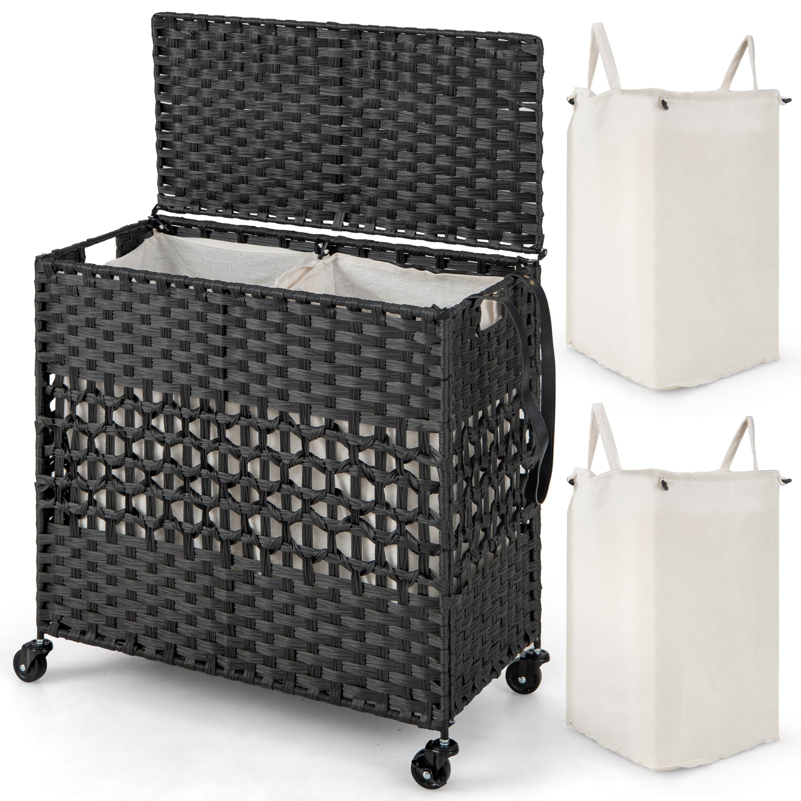 The steel frame is covered with PE rattan, both are very durable for long-term use. And its 2 separate liner bags are made of soft polycotton fabric to protect clothes from being scratched. Also, since they are fixed with pre-installed buckles, you can easily remove liner bags for machine washing. More, the laundry basket has multiple details for easy movement. On each side, there is a recessed handle and a PU strap. At the bottom, there are 4 universal wheels (2 lockable). Thus, multi-scene use becomes more convenient. Finally, the folding frame allows for compact storage after use. If you are looking for a laundry hamper like this, do not hesitate to place an order!
