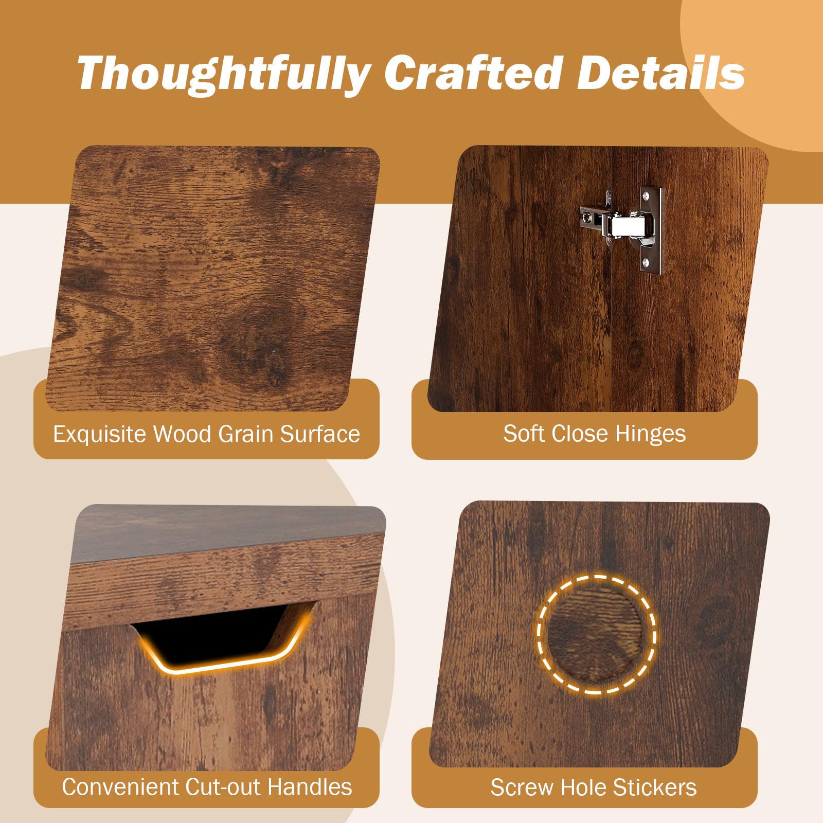 Versatile and practical, this folding coffee table features a quick-folding tabletop supported by rolling brackets with reinforcing latches, making it perfect as a coffee table, side table or nightstand. It offers ample storage with a 2-door cabinet. Crafted from sturdy boards, the center table can hold up to 90kg. Also, it comes with 4 smooth universal wheels, 2 of which are lockable, ensuring easy mobility and stability. The rustic design and screw hole covers give it a charming look that blends seamlessly with different interior styles in living rooms, studies, bedrooms, etc. More well-made details await your discovery.