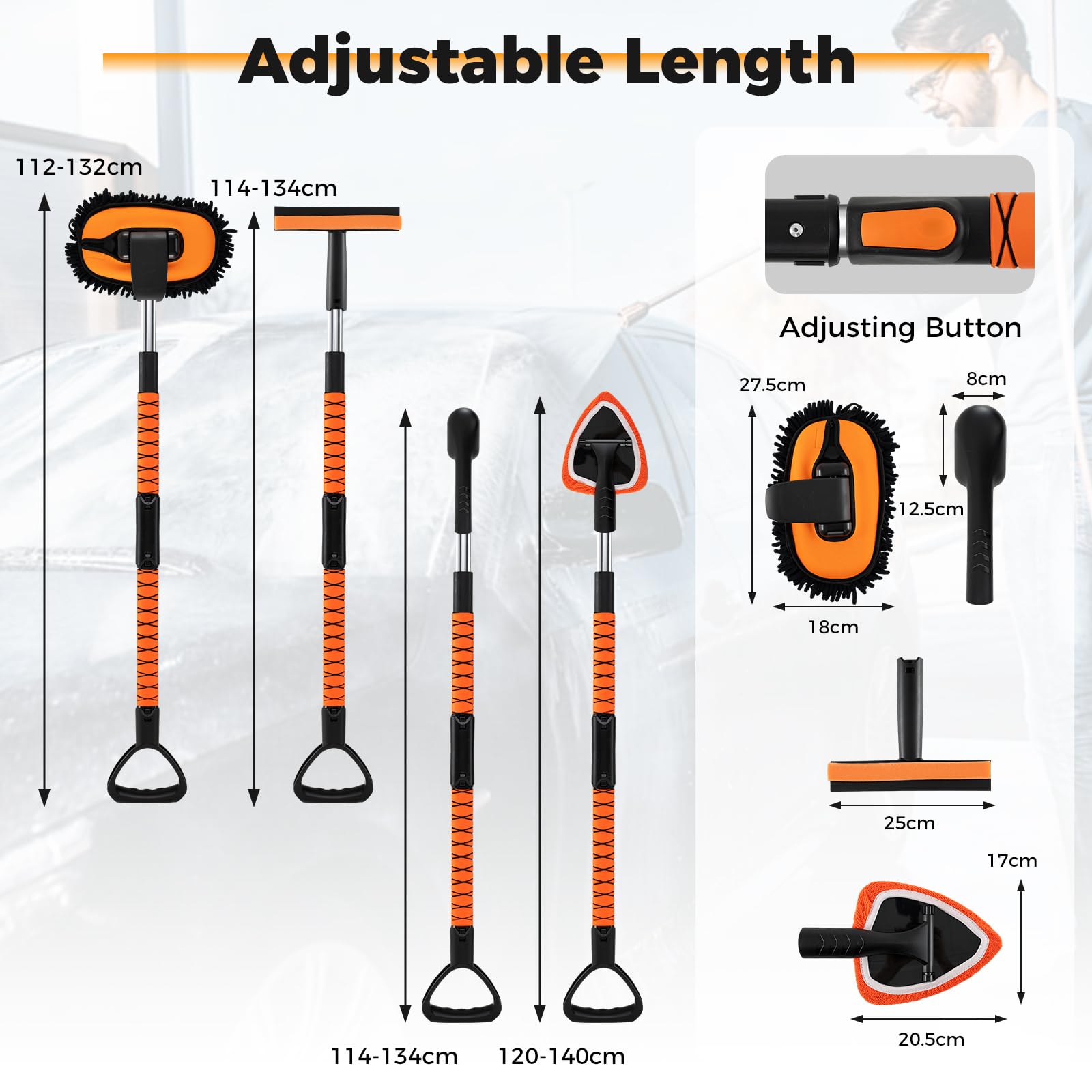 Comprehensive Cleaning Kit: This carwash set includes a retractable handle, chenille mop, cloth window cleaner, sponge squeegee, tire brush, polish sponge and soft bristle brush, providing all the essential tools for thorough vehicle cleaning.