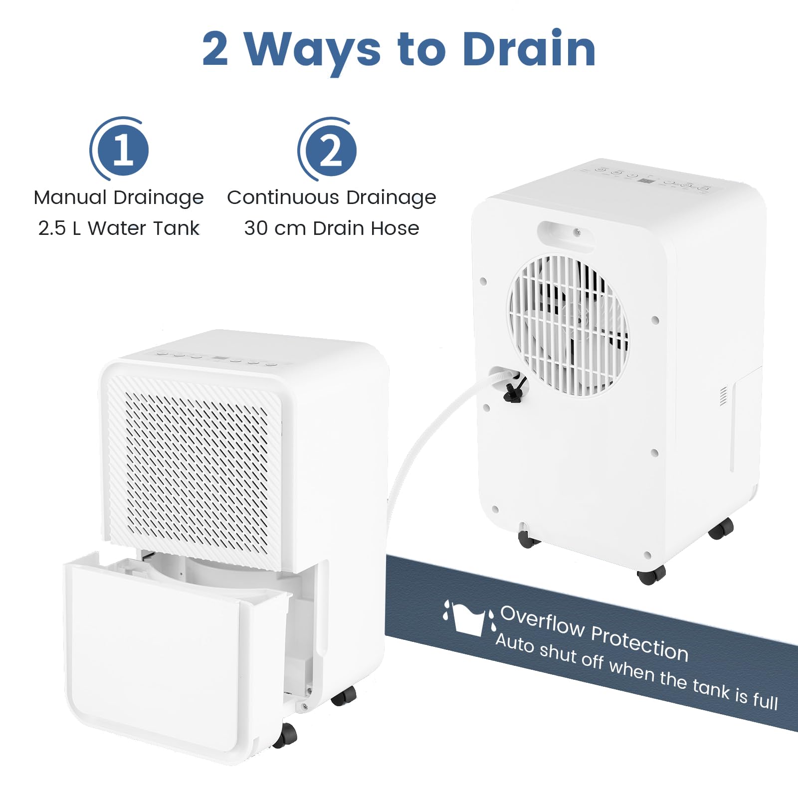 2 Drainage Options: You can empty the 2.5 L water tank manually or connect the included 30 cm drain hose to the dehumidifier for continuous drainage by gravity. The auto defrost function and overflow protection provide enhanced safety and durability.
