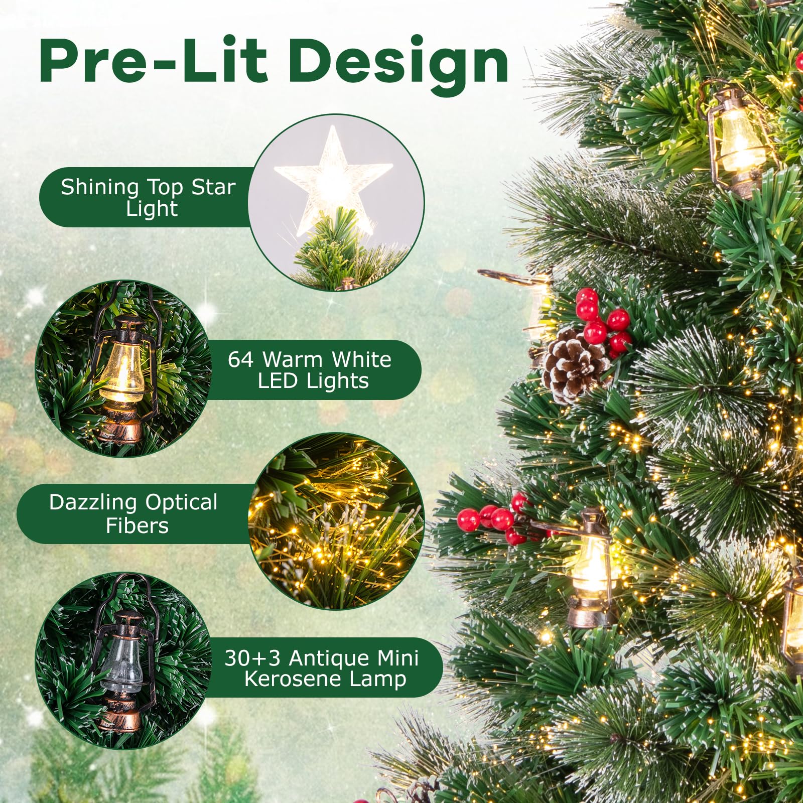 Beautiful Lighting Display: Illuminate your holidays with 49/64 warm white LED lights evenly distributed among the treetop star and 20/30 antique kerosene lamps. Besides, the Xmas tree also offers the attractive sparkle of charming optical fibers.