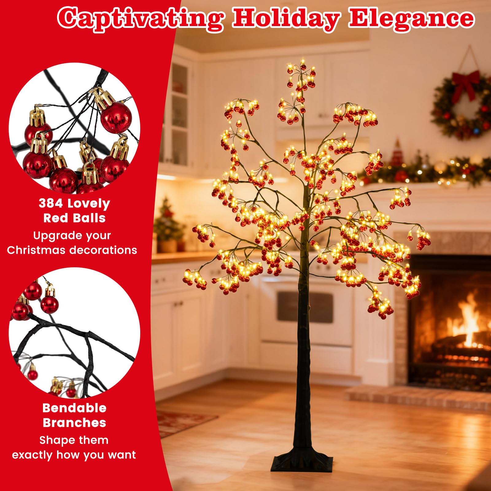 The 150 cm festive Xmas tree glows with 480 warm white LED lights that cast a cozy glow and offer captivating holiday elegance - perfect for holiday gatherings. Decorated with 384 vibrant red balls, it adds a timeless splash of color to any setting: home, office, or festive event. Bendable branches let you shape the tree exactly as you like, creating a unique, eye-catching centerpiece. A sturdy square base, anchored by 4 metal ground stakes, ensures safe using and keeps it stable all season long.