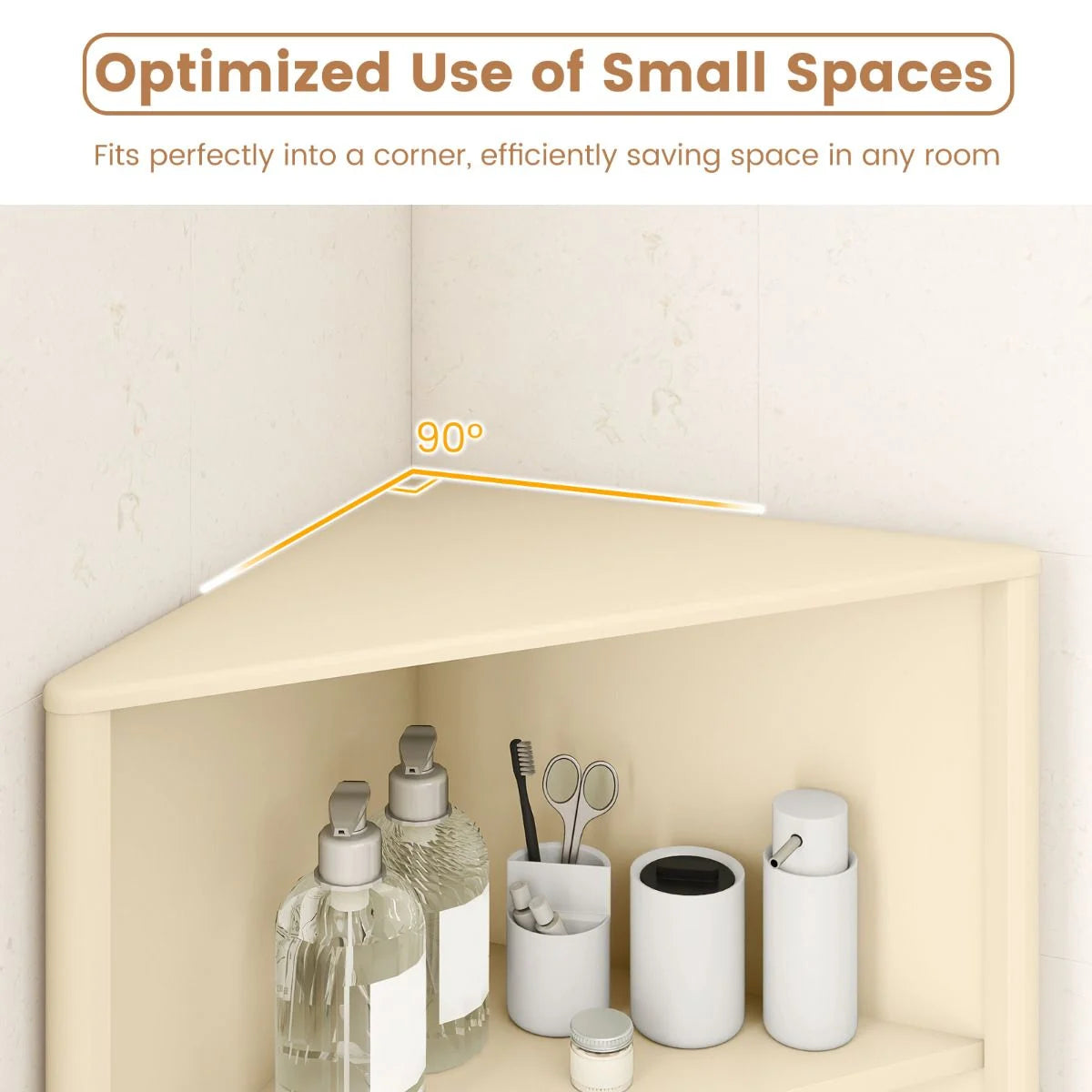 Stylish Modern Touch: Featuring waveform fluted doors, delicate knobs and rounded edges, the freestanding corner shelf offers a stylish and elegant look. Its versatile aesthetic makes it an attractive addition to bathrooms, living rooms, or kitchens, seamlessly blending with various interiors.