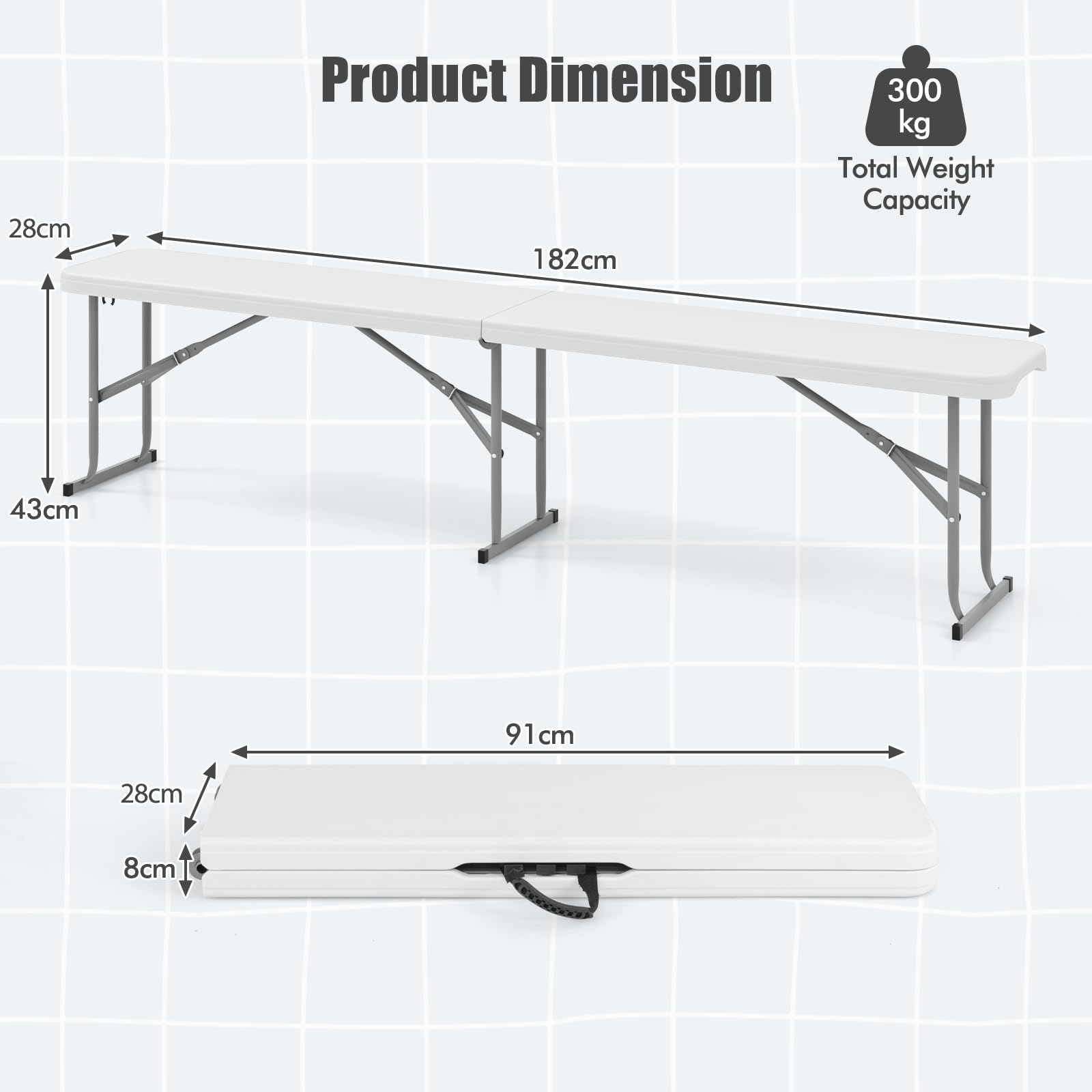This folding bench measures 182 x 28 x 43 cm (L x W x H) and loads up to 300 kg, which could comfortably accommodate 3 people, providing additional seating for various outdoor and indoor activities. It is ideal for dining, picnics, barbecues, parties, sports events, camping trips, and more. When not in use, just fold it in half, and there is a handle on the side, making the bench easy to carry and transport for on-the-go use. Other than that, it adopts a weatherproof and crack-resistant HDPE seat, ensuring superior strength and durability. And the heavy-duty powder-coated metal frame enhances overall sturdiness and stability, providing robust support for every activity.