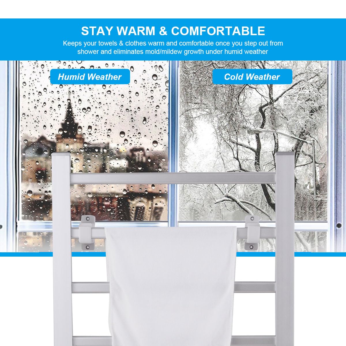 Quick Heating and Constant Warming: This wall-mounted towel warmer can heat up and reach the temperature of 45℃-50℃ within 10-15 minutes after you turn on the switch. (Note: The heating time may vary due to the different conditions). The bathroom drying rack will keep the mild temperature and won’t hurt your hands. Useful for keeping your clothes warm and dry in wet or cold weather.