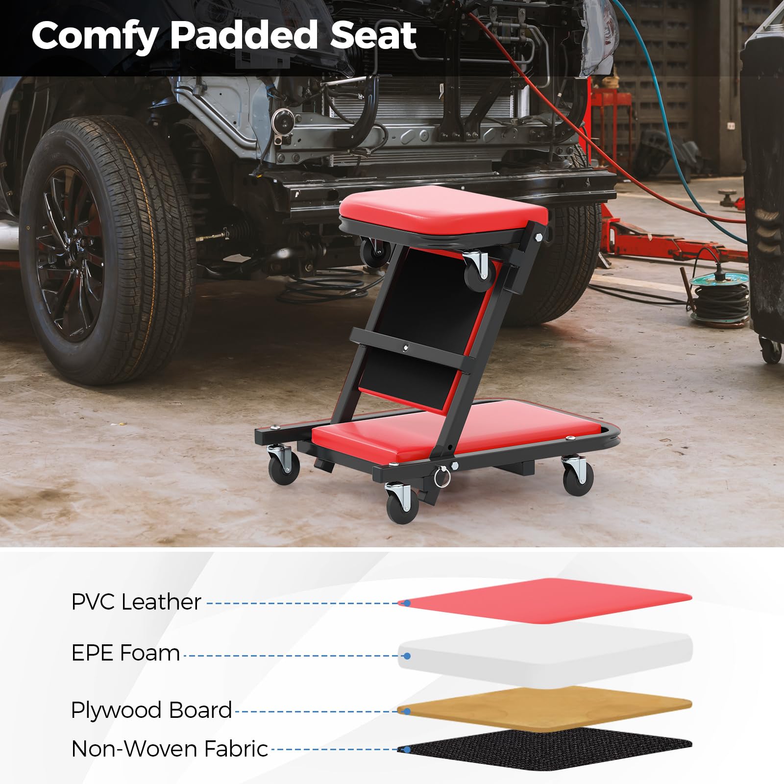 Comfy Padded Seat: Experience comfort during long work sessions with the creeper’s multilayer construction, featuring PVC leather, EPE foam, plywood board and non-woven fabric. This design ensures optimal comfort and relief from fatigue.