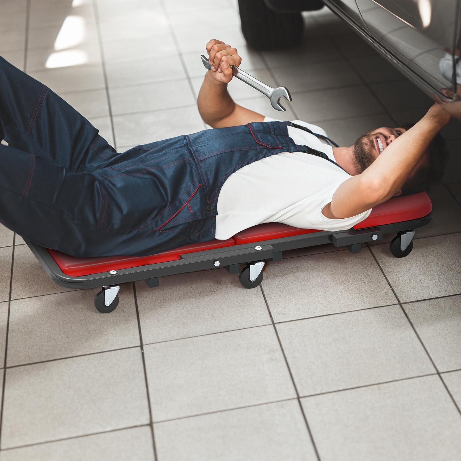 Seamlessly switching between sitting and lying positions, the mechanic creeper will cater to your specific needs during any automotive task. Constructed from a robust metal frame with deformation resistance, the creeper offers unmatched stability. Whether lying down or sitting, the plush multilayer padding ensures prolonged comfort as you work. Upgrade your workflow and tackle projects with ease, making every task smoother and more efficient with this essential garage tool featuring thoughtful details.