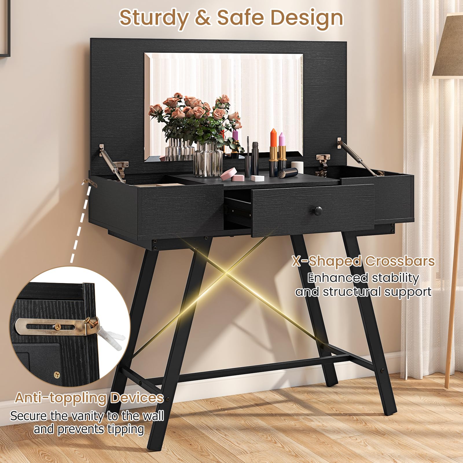 2-in-1 Design: Our vanity desk features a flip-top design with robust gas struts for effortless lifting. The wide tabletop offers a seamless writing surface, and when lifted, it reveals a mirror and an additional worktop, catering to both work and makeup needs.