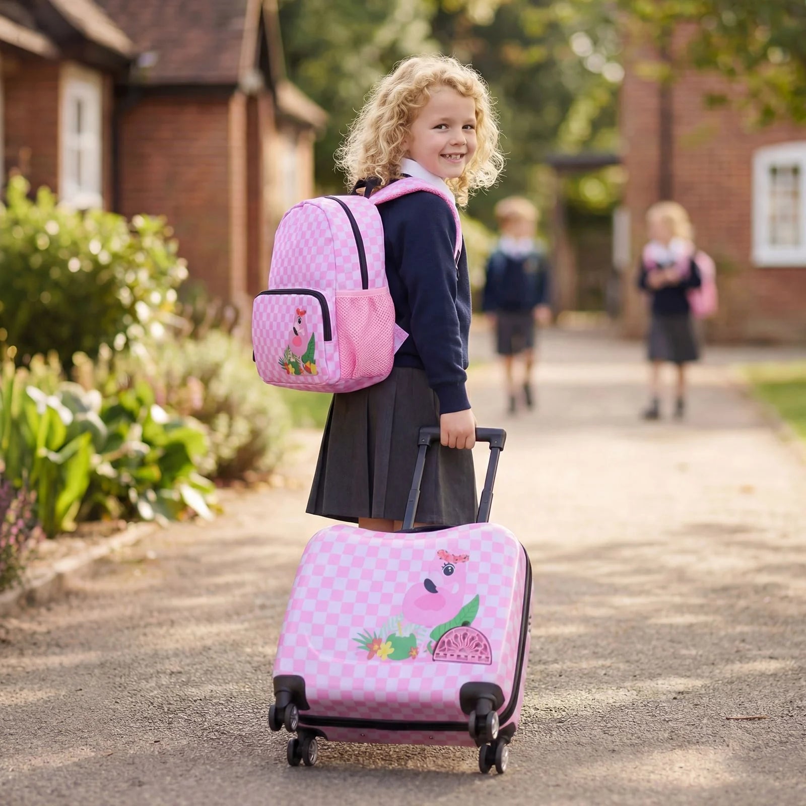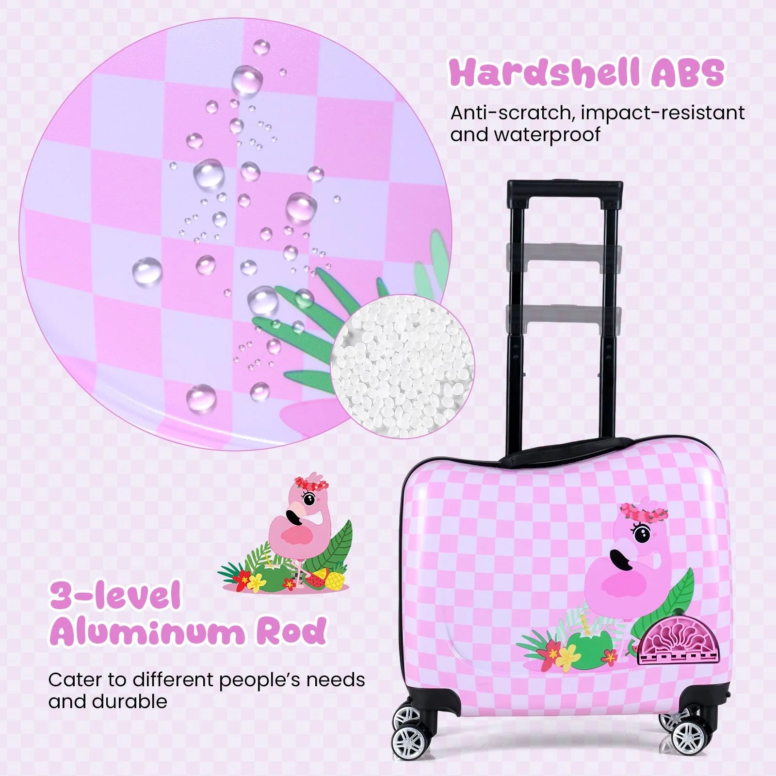 This luggage set includes an 46cm hardshell suitcase and a 28 cm backpack, which are airline-approved carry-on. It also provides ample and classified storage space to meet all the travel needs, such as toys, clothes, snacks, books, toiletries, etc. Designed with versatility in mind, this suitcase can not only be pulled to move, but also allow your kid to sit on and ride on, offering a fun and innovative way to travel. And it is equipped with a multipurpose rope for pulling and preventing loss, which can be connected to the suitcase or the backpack. Furthermore, it comes with a detachable carrying strap, allowing you to easily carry it when rushing to the car or check-in gate. Thanks to the retractable handle and spinner wheels, kids can easily move it around by themselves. Safety is our top priority, which is why our suitcase is made from anti-scratch PC and ABS materials and it adopts a solid aluminum rod, providing durability and stability. And let's not forget the stylish and adorable patterns that add a touch of fashion to your travel gear.