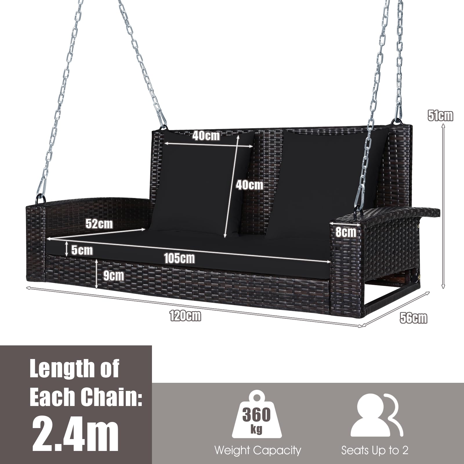 The high-density seat and back cushions offer you soft and comfortable sitting feeling during swinging. And the solid steel chains connect the porch swing to the wall or brackets firmly to ensure your safety. Moreover, constructed of heavy-duty steel frame, the porch swing can load up to 360 kg, which is enough for two adults to sit together. And the rattan surface is not only of elegant appearance, but also not easy to fade. Thus, the porch swing is perfect for outdoor use and you can hang it in multiple places like garden and front porch. If you are looking for a patio swing for relaxation, our rattan porch swing bench will be a wonderful choice.