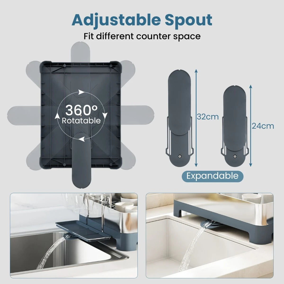 Efficient Drainage System: Featuring a large bottom tray with an expandable, 360° rotatable spout, this dish drying rack allows versatile placement around your sink or countertop. The fast drainage ensure that dishes are ready to use or put away much quicker.
