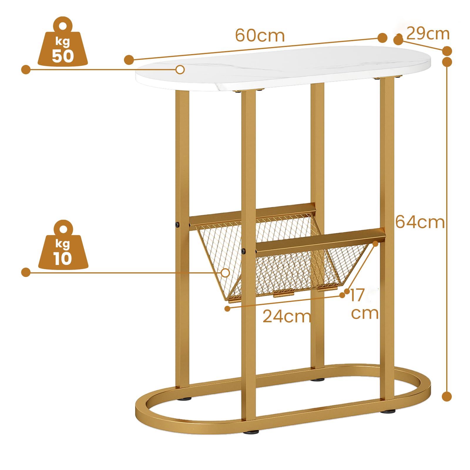 Space-saving Design: This narrow side table is designed with a slim profile, measuring 60 x 29 x 64 cm and featuring a compact footprint, making it ideal for small spaces where every inch counts. Plus, the oval shape with round edge design reduces risk of bumps and scrapes.