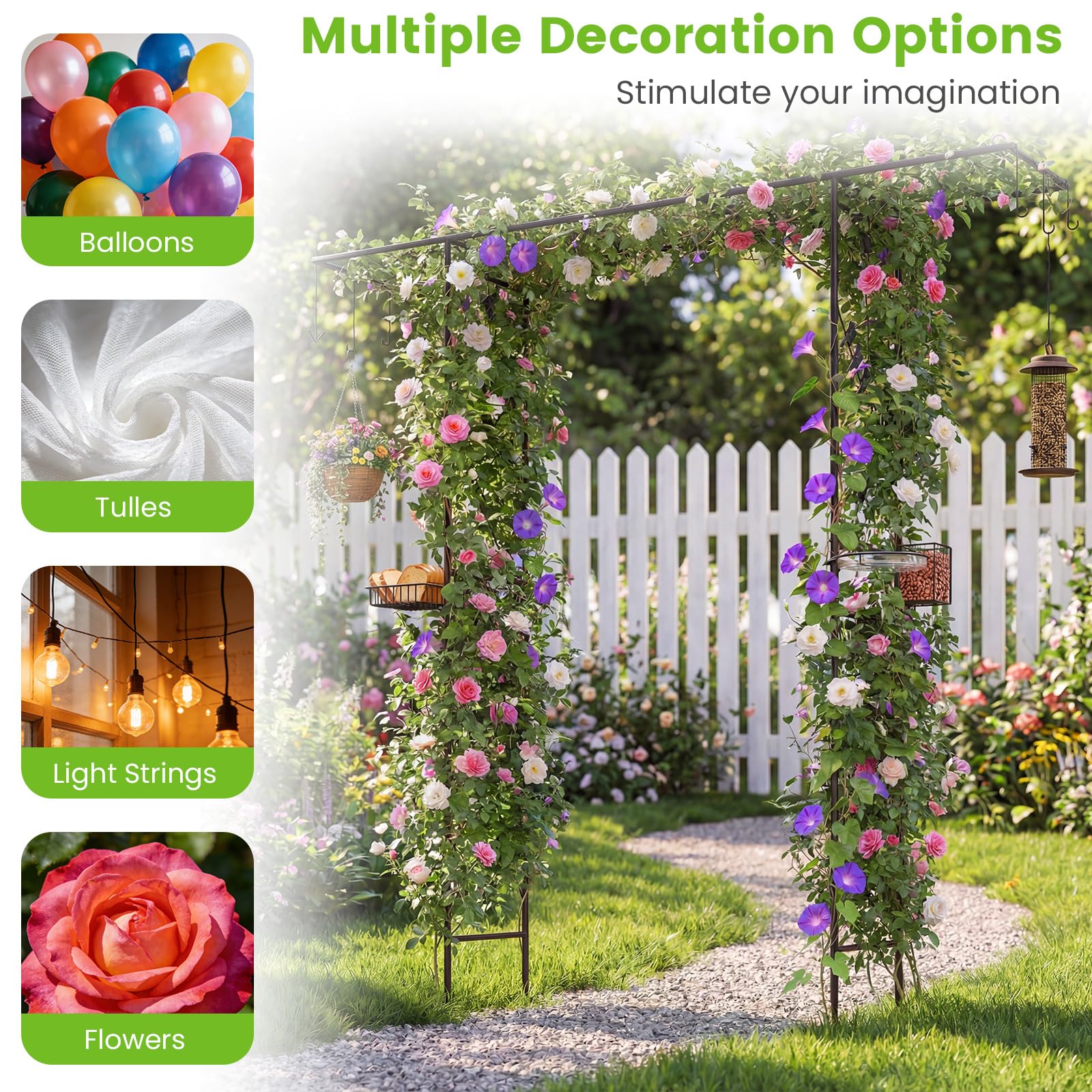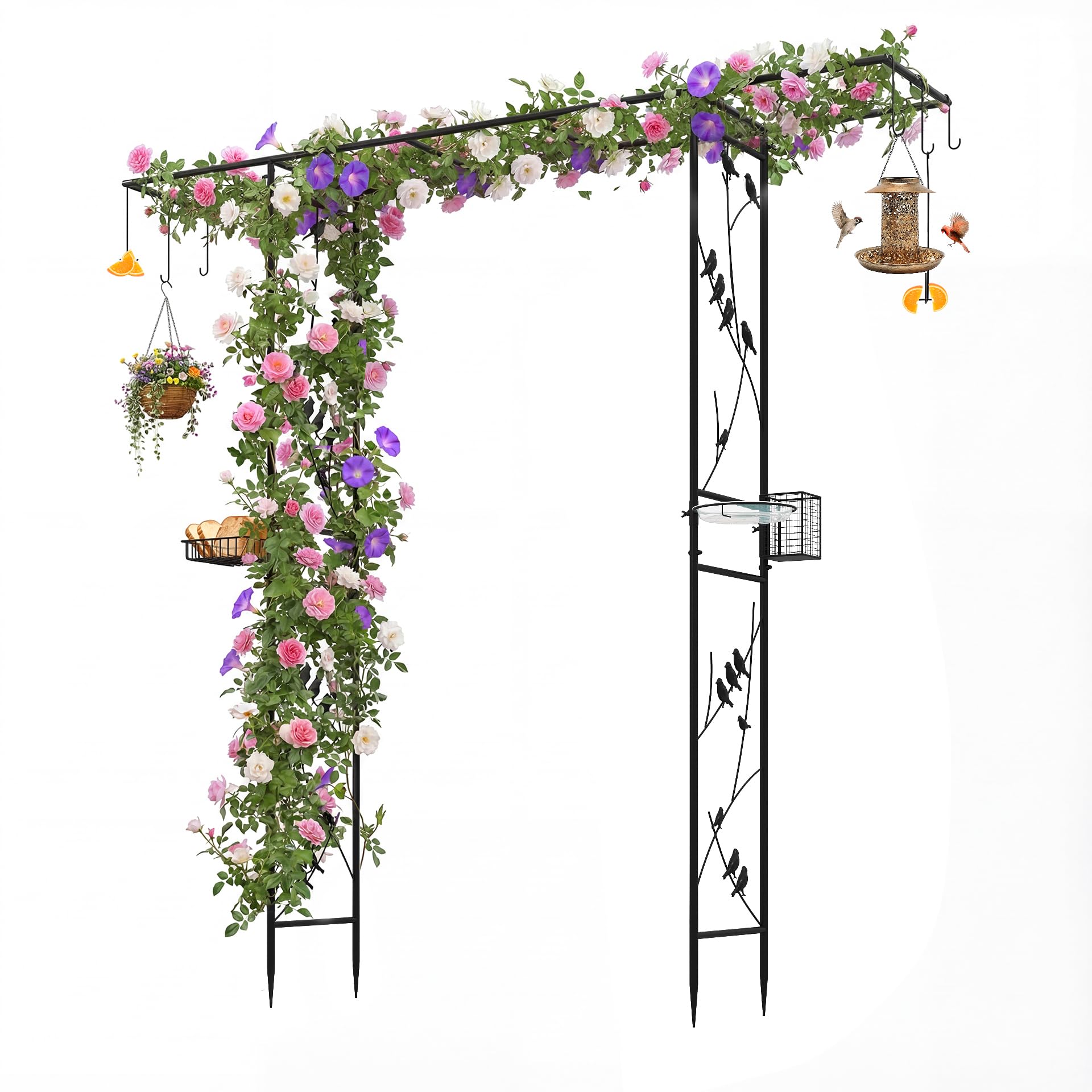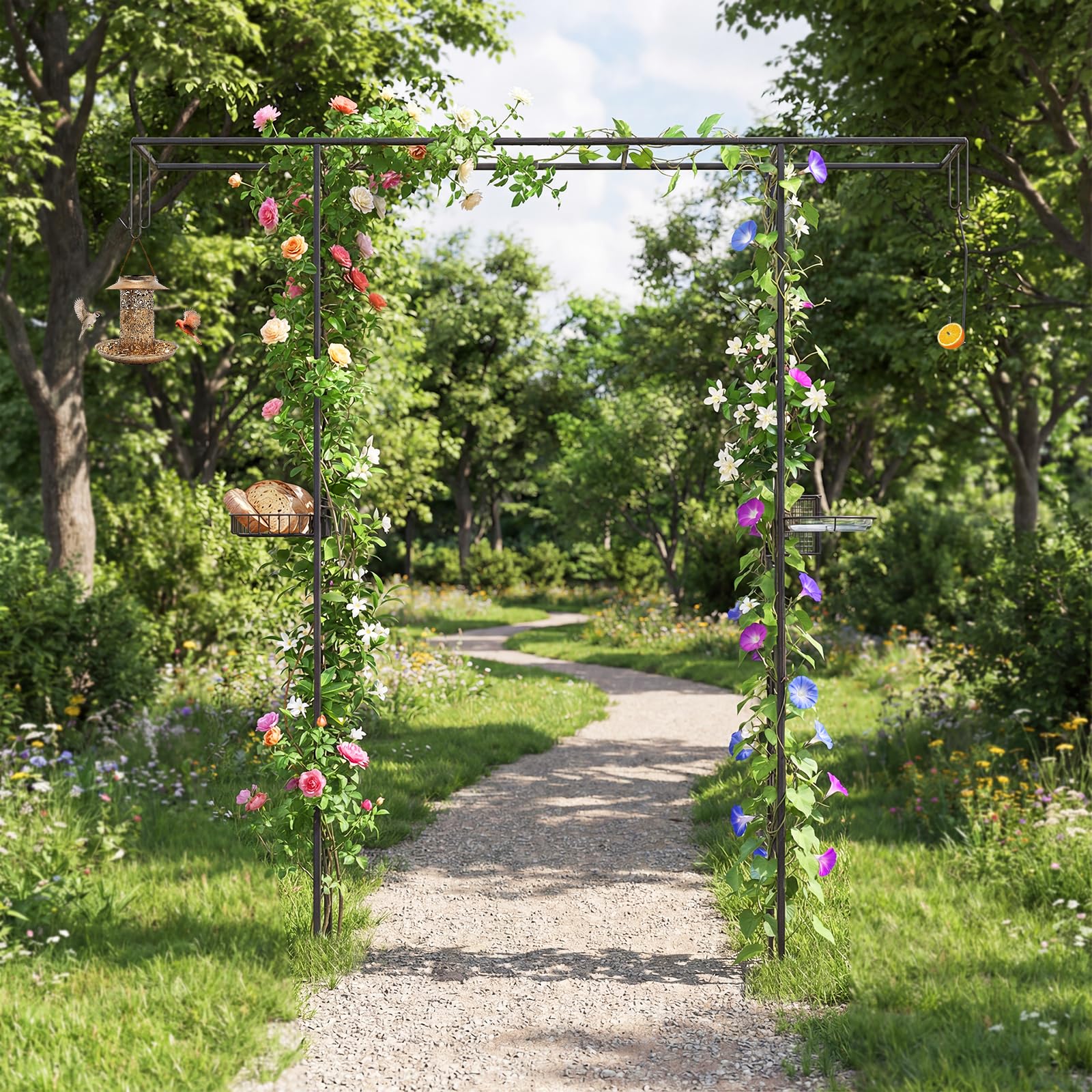 Multiple Decoration Options: Featuring 7 versatile hooks, the metal garden archway allows you to display lanterns, hang baskets, or bird feeders for visiting birds. These hooks can be hung at any positions you want. Plus, the extended flat top can be decorated with balloons or vines for a charming appearance.