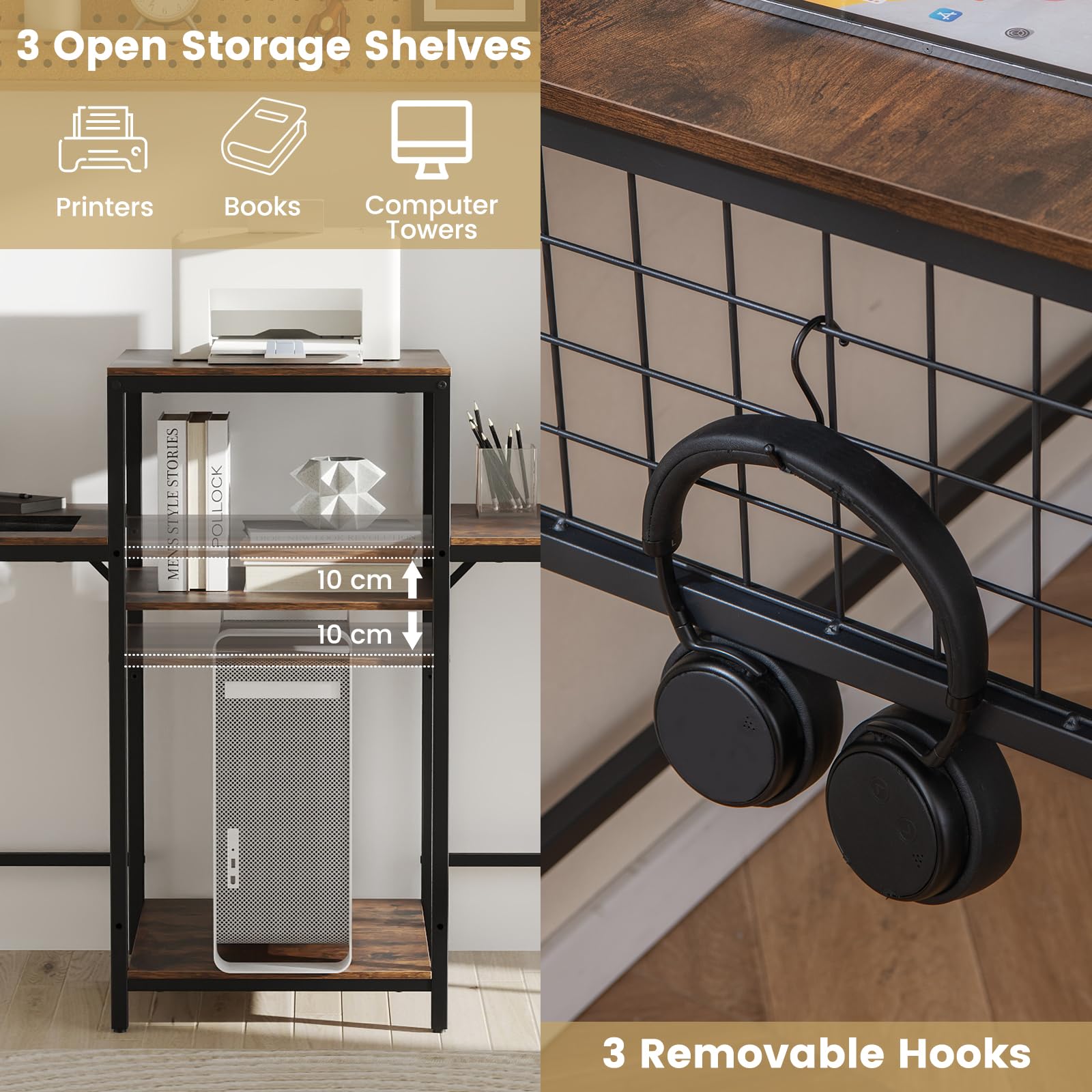 Versatile Storage Solutions: Say goodbye to clutter with this computer desk’s multi-functional storage! The 3-tier rack features a top shelf for your printer, a middle shelf with 3 adjustable positions, and a bottom shelf for your computer tower, plus 3 removable hooks for extra convenience.