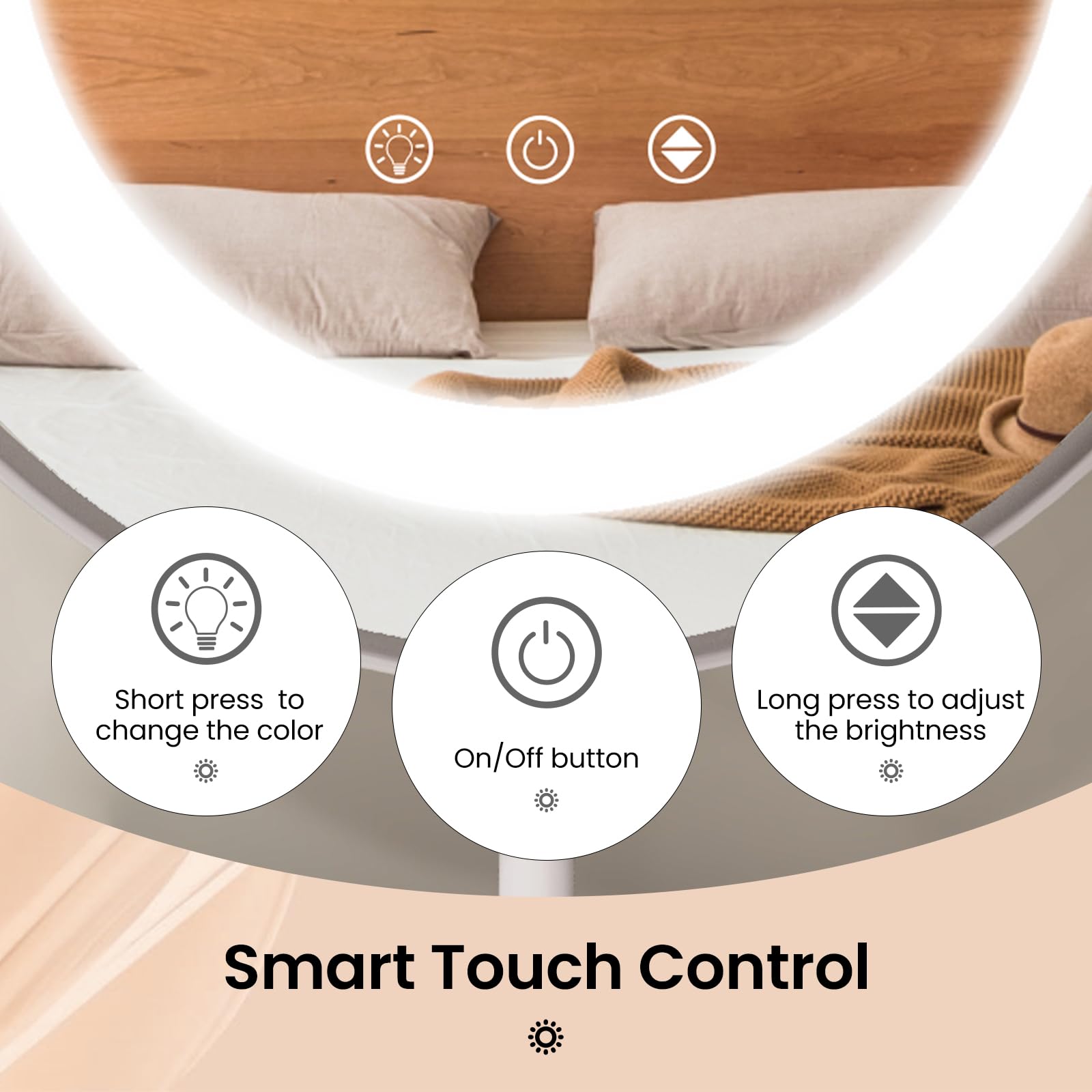 Memory Function and Touch Switch: With the built-in memory function, our makeup mirror retains the last used-used settings, saving you the hassle of readjusting the lights every time you use it. The smart touch switch makes operation easy: short press to change the color, long press to adjust the brightness.