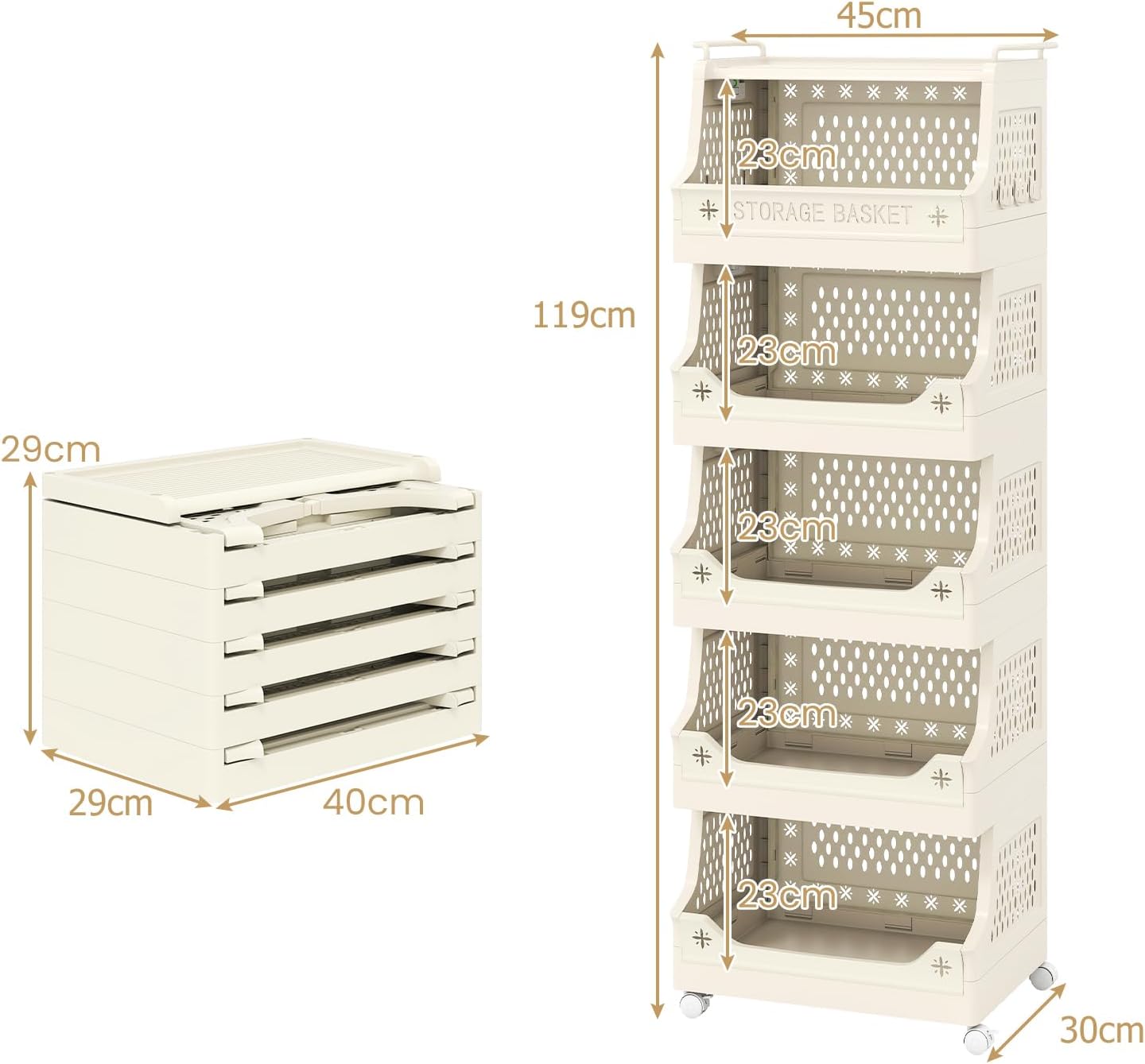 This versatile storage basket features 2/3/4/5 open shelves and a spacious top, complemented by 6 handy hooks for hanging items. Its breathable hollow patterns ensure proper ventilation, keeping your clothes fresh. Meanwhile, this laundry basket is equipped with 4 universal casters, 2 of which are lockable, and side handles for effortless maneuvering. Easy to assemble with a buckle design and a sliding button for fixation, it can also be quickly disassembled when not in use to save space. It can serve as a laundry basket, a bathroom organizer or a storage cart for various items. This is a multi-functional addition to your home, offering convenience and style.