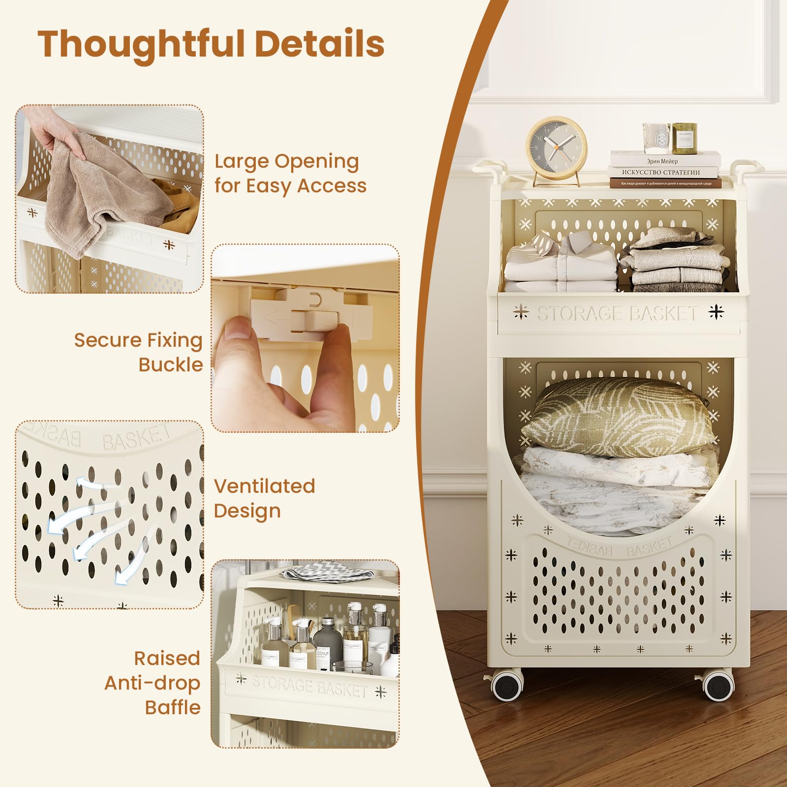 This 3/4-tier laundry cart combines a hanging rail for air-drying clothes, a spacious hamper and 1/2 baskets for garments, socks or blankets, along with a top shelf for detergents. Plus, 6 extra hooks holds towels or brushes with ease. The tool-free assembly lets you unfold and secure it in seconds, and it collapses flat for compact storage. With 4 universal wheels (2 lockable), it glides effortlessly between rooms and stops exactly where you need it. Besides, raised baffles and ventilated design keep items secure and fresh. Simplify laundry day with this versatile 3/4-tier laundry basket trolley on wheels!