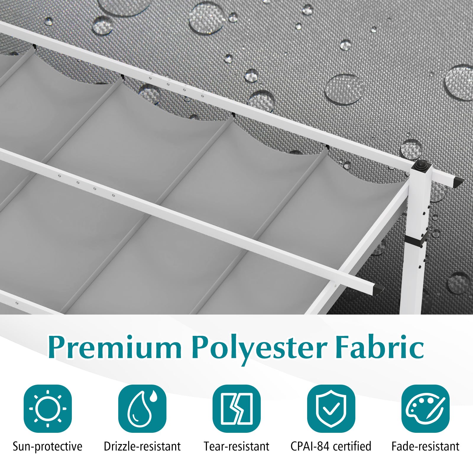 Our 368 x 305 cm outdoor pergola provides a 11 m2 large footprint, which is ideal for enjoying outdoor entertainment with your family and friends. In particular, the canopy can be easily retracted or unfolded by smoothly rolling pulleys and a rope loop, thus it could create an ideal level of shade and protection as weather conditions change. And the canopy is crafted of flame-resistant and weatherproof polyester fabric, providing added safety and longevity. Thanks to its thick aluminum columns and 4 corner reinforced plates, this pavilion provides unparalleled durability and stability. With its unique and elegant appearance, this pergola could also add a touch of charm and style to your outdoor living space.