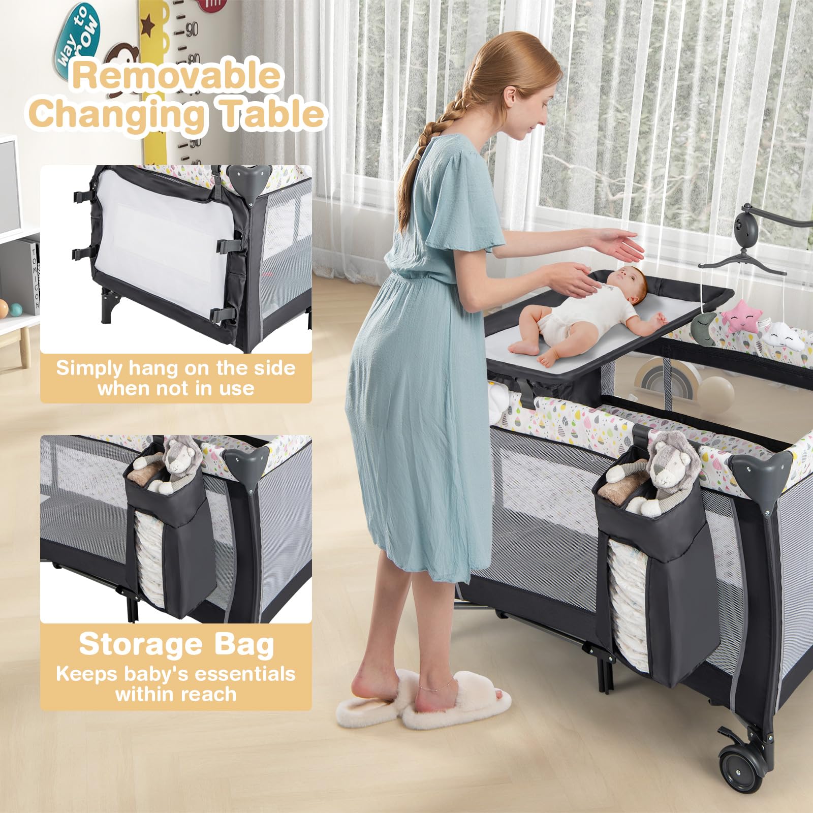 Great Stability & Mobility: 7-point support structure ensures overall steadiness and stability, making it strong enough to support your baby. Moreover, the 3 in 1 pack and play comes with 4 rolling wheels for smooth movement. 2 of the wheels are lockable to keep it still.
