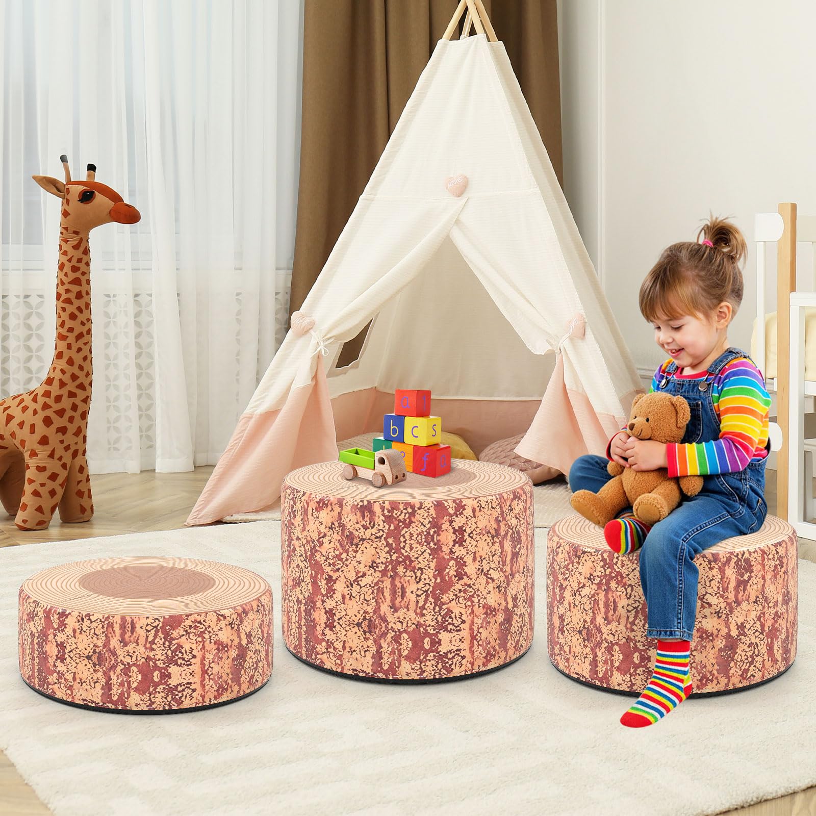 Natural Wood Printing: Featuring realistic wood grain printing, this 3-piece tree stump stool set creates a whimsical forest atmosphere wherever you place them. It is a versatile addition to any space, perfect for kids room, playroom, kindergarten, classroom, picnic and more.