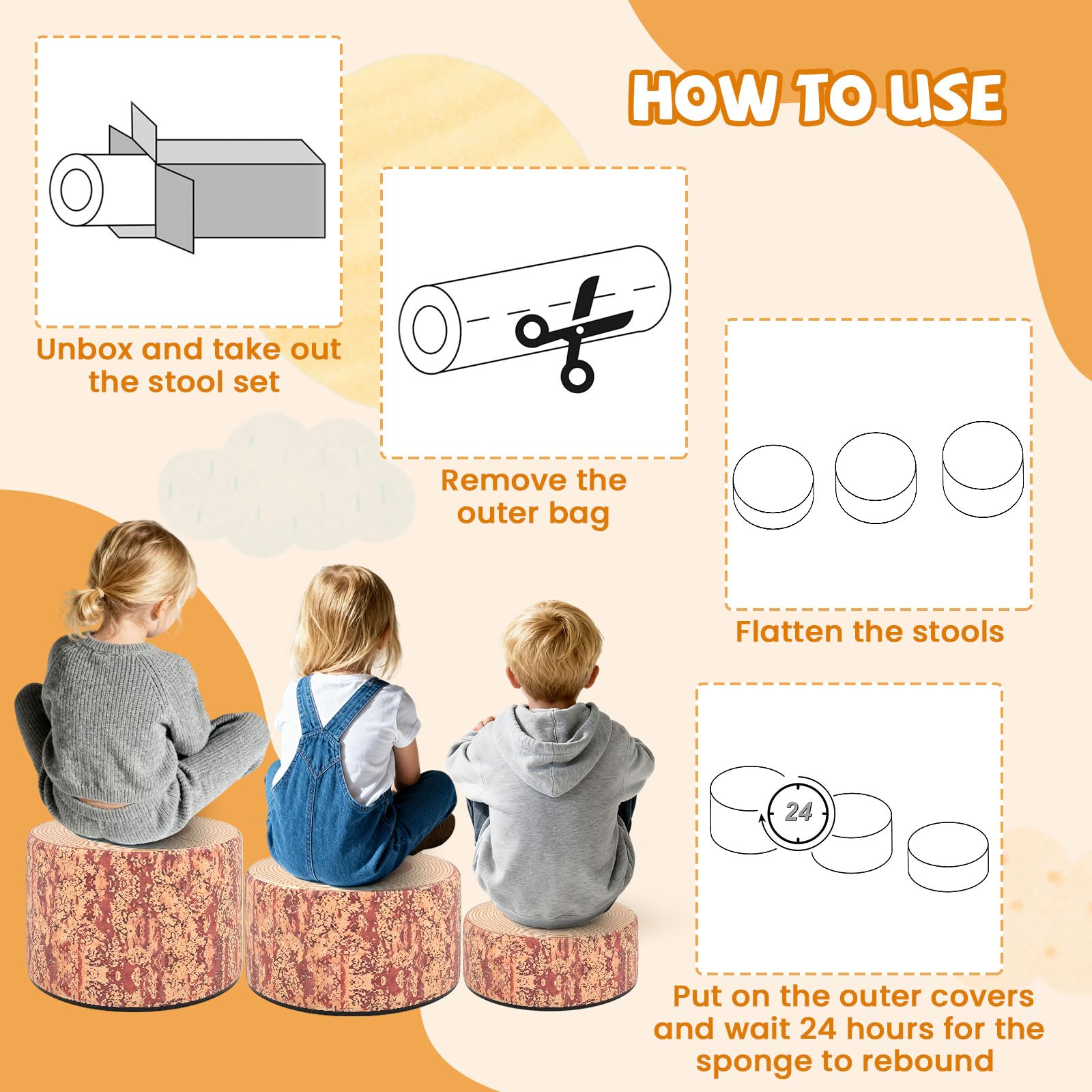 How to Use: Coming in compact vacuum packaging, this 3-piece tree stump stool set is easy to set up and use: first, unbox and take out the stool set, remove the outer bag and flatten the stools. Next, put on the outer covers and wait 24 hours for the sponge to rebound.