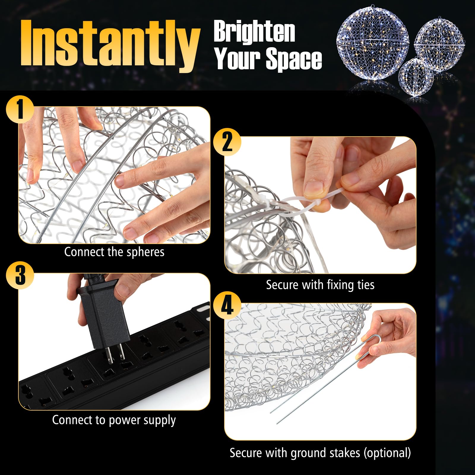 Instantly Brighten Your Space: Easy to put together using the included zip ties, these metal sphere lights let you set up your display in minutes. When the festive season ends, the balls detach just as easily and nest inside each other for compact storage, so you can reuse them year after year.