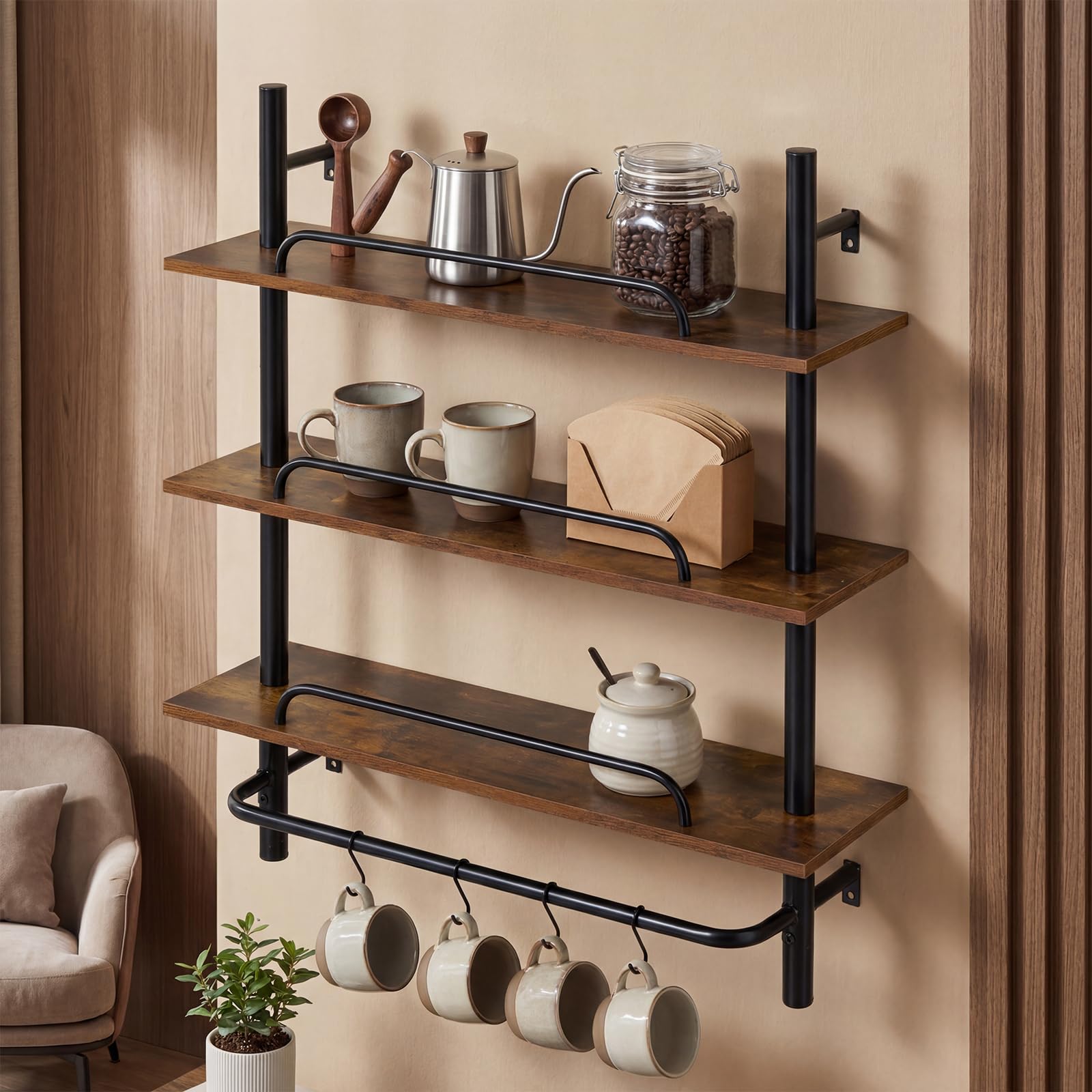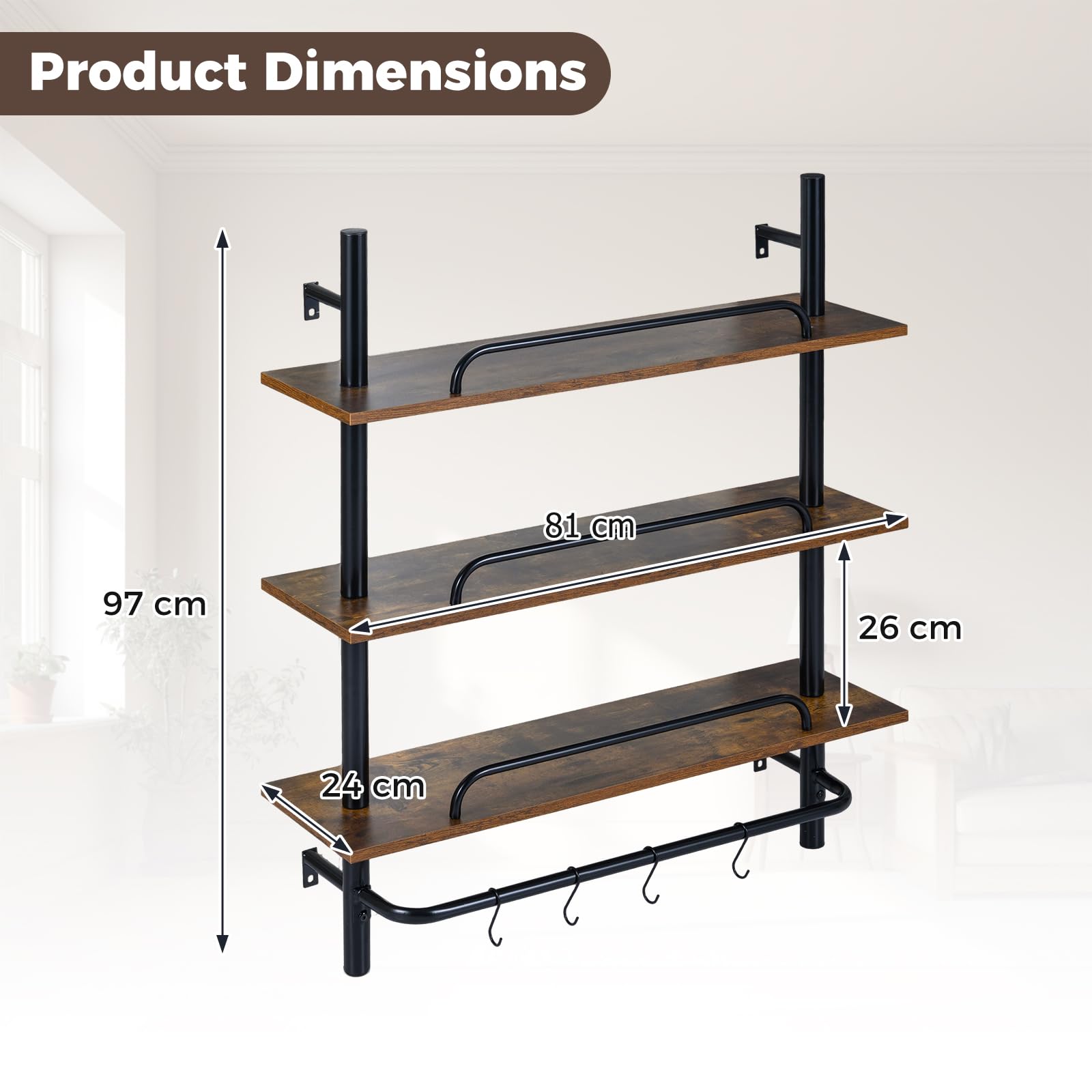 The industrial pipe shelving features 3 spacious tiers with anti-falling baffles that keep your belongings secure while maximizing your organization. Equipped with 4 removable S-shaped hooks, it offers flexible hanging options to suit various needs. The thickened wooden boards combined with sturdy metal frames ensure reliable durability and support. Its wood-like, rustic brown surface, paired with black metal pipes, creates an industrial style.