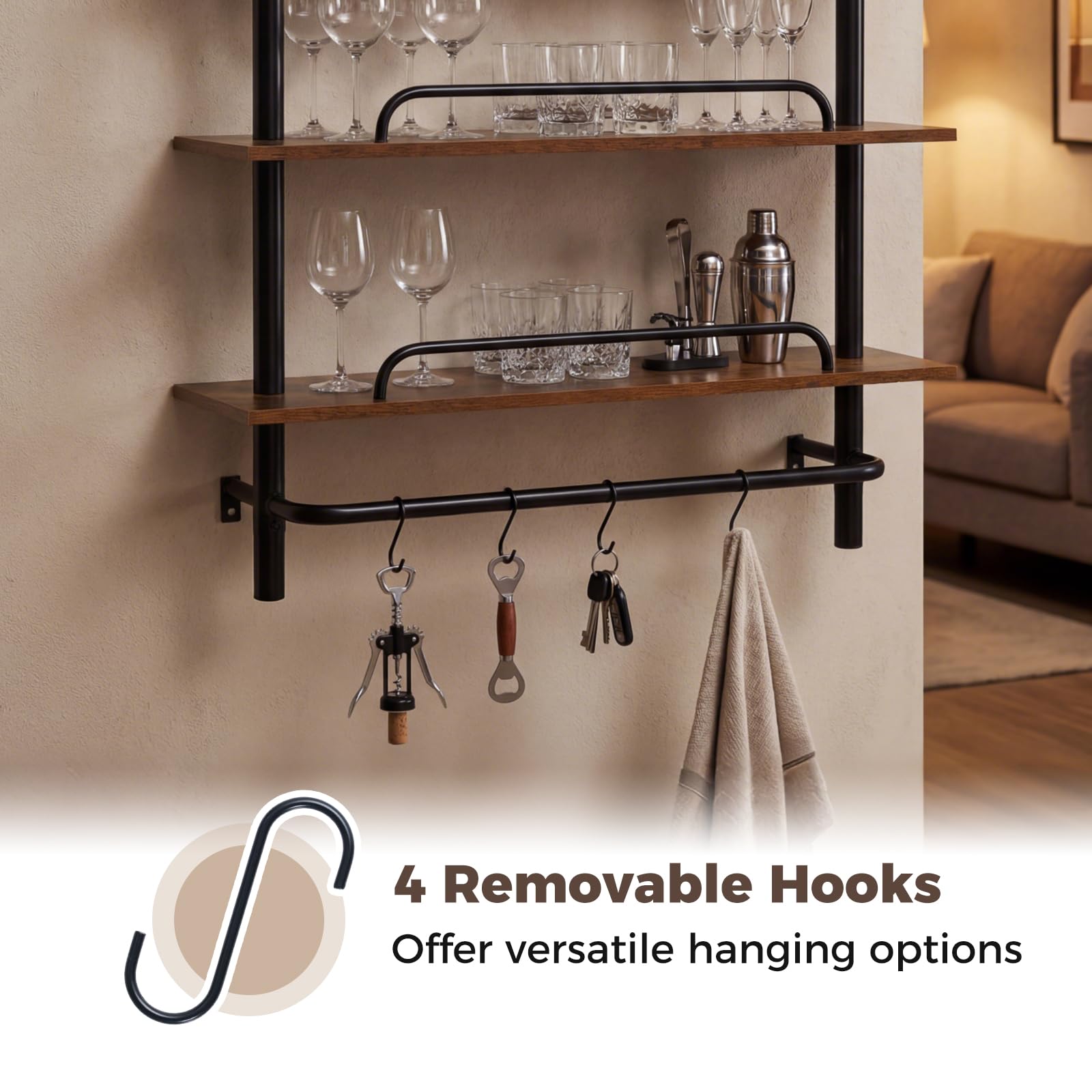 Flexible Hanging Hooks: Featuring 4 removable S-shaped hooks, the wall-mounted kitchen shelves allow customizable hanging options to keep your space organized and clutter-free.
