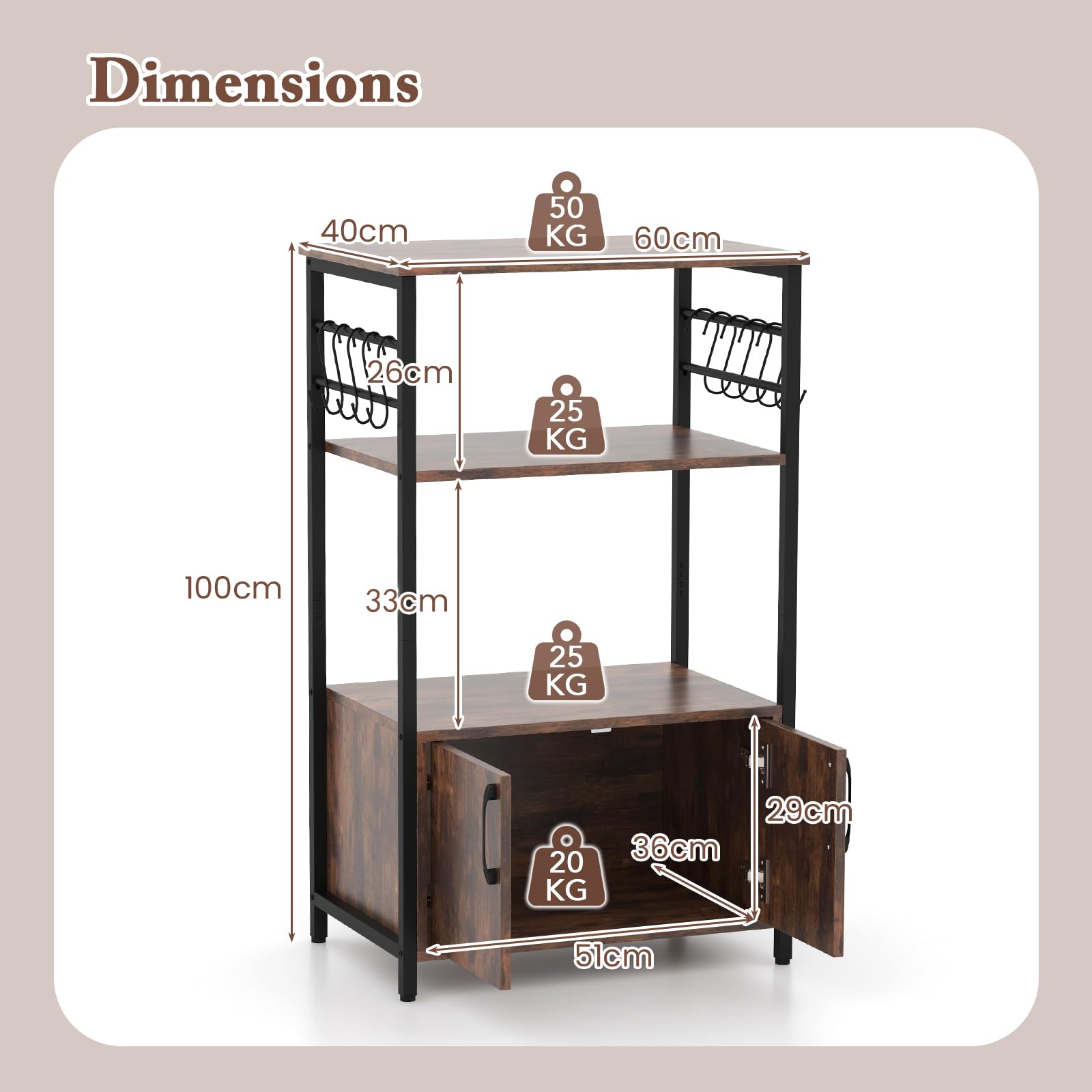 3-Tier Kitchen Bakers Rack with Cabinet Open Shelves and 10 Removable S-Shaped Hooks