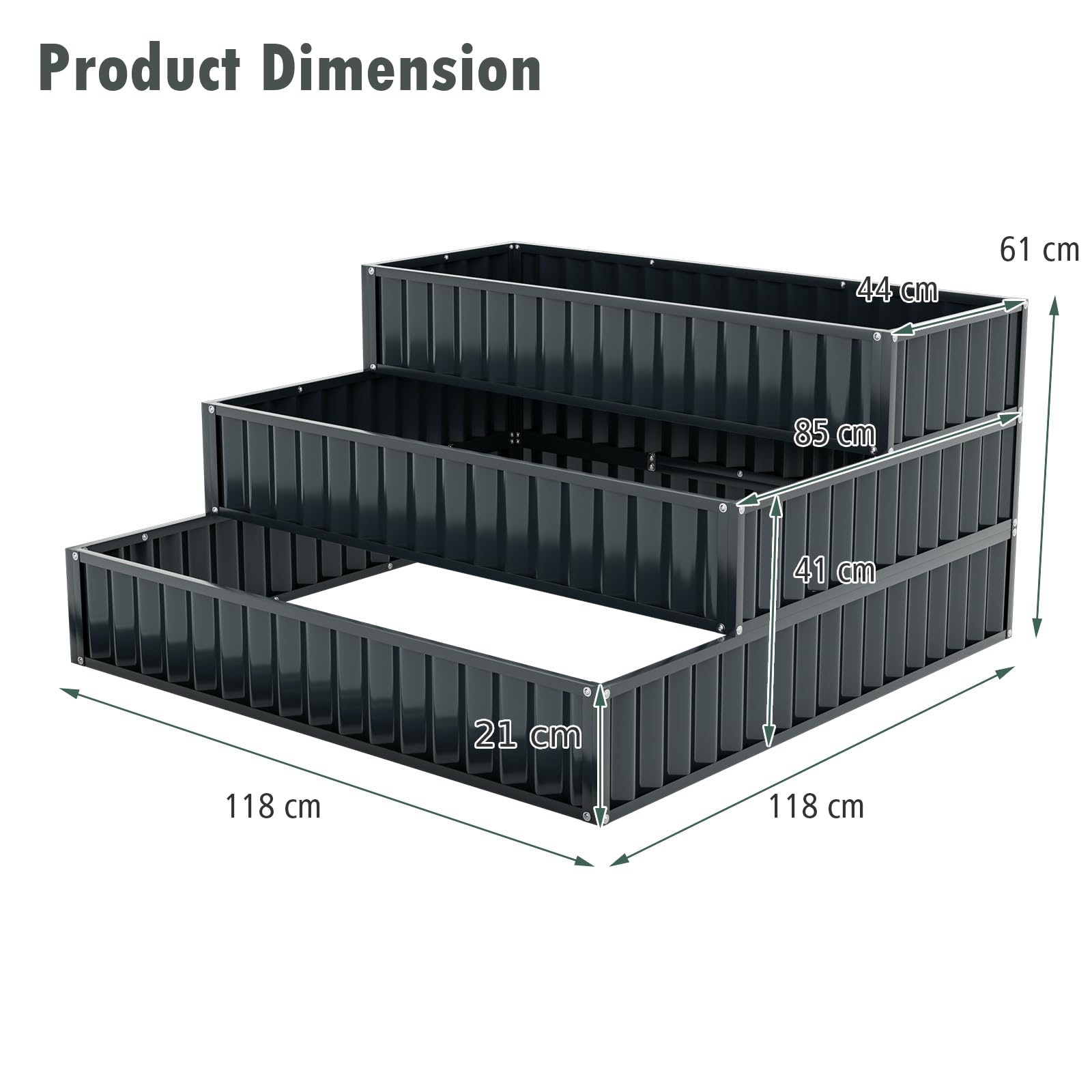 Our metal raised garden bed measures 118 x 118 x 61 cm (L x W x H) and comes with 3 tiers, providing ample space for cultivation while allowing you to cultivate plants with different roots and sizes. Moreover, in addition to being used as a 3-tier raised garden bed, it can also be used as 3 separate planter boxes, giving you the freedom to create a customized garden layout. Crafted from heavy-duty powder-coated metal panels, this garden bed ensures durability and resistance to rust and fading. Other than that, the garden bed boasts an open-ended base, which promotes proper drainage and air circulation for fostering root growth. Whether planting in the backyard, garden, greenhouse, or vegetable field, our large metal raised garden bed can be a perfect choice!