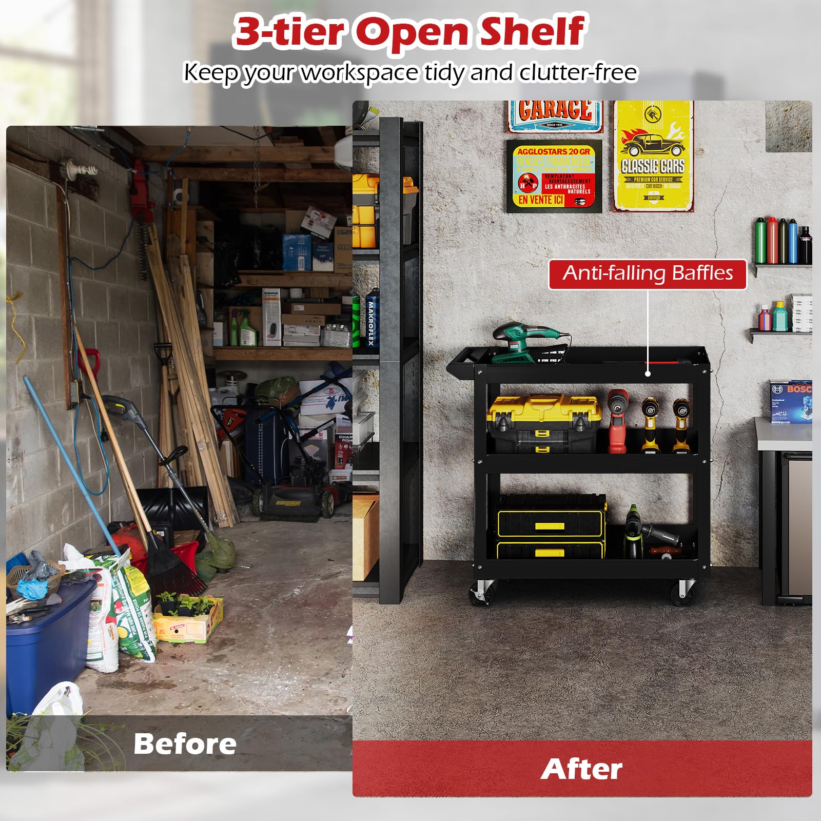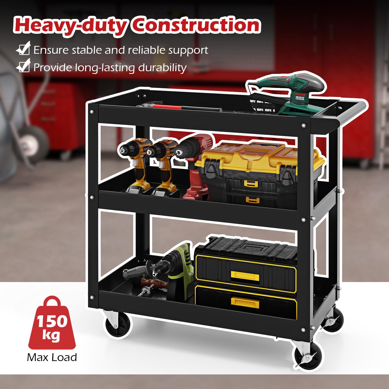 Multi-use Tool Cart: Designed with 3 large storage shelf, this convenient tool cart is perfect for use in garages, kitchens, offices, workshops, hotels and restaurants. In addition, equipped with a sturdy handle, you can transport it to any places.