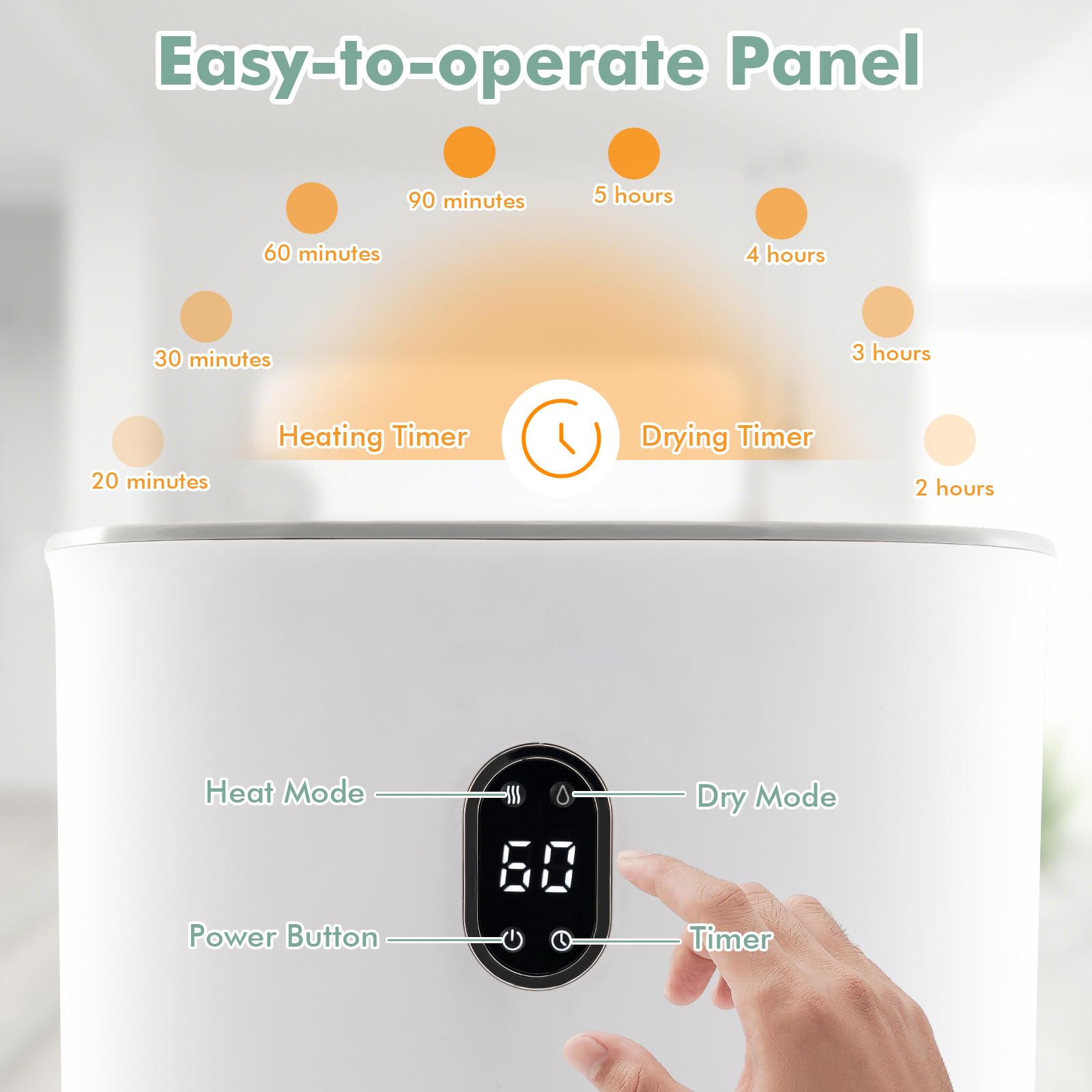 2-in-1 Design and Easy Operation: This towel warmer for bathroom provides 2 modes: heat/dry. And each mode has a timing setting: 20-90 mins heating, 2-5 h drying. Additionally, the clear LCD display and touch buttons make it easy for you to use and operate.