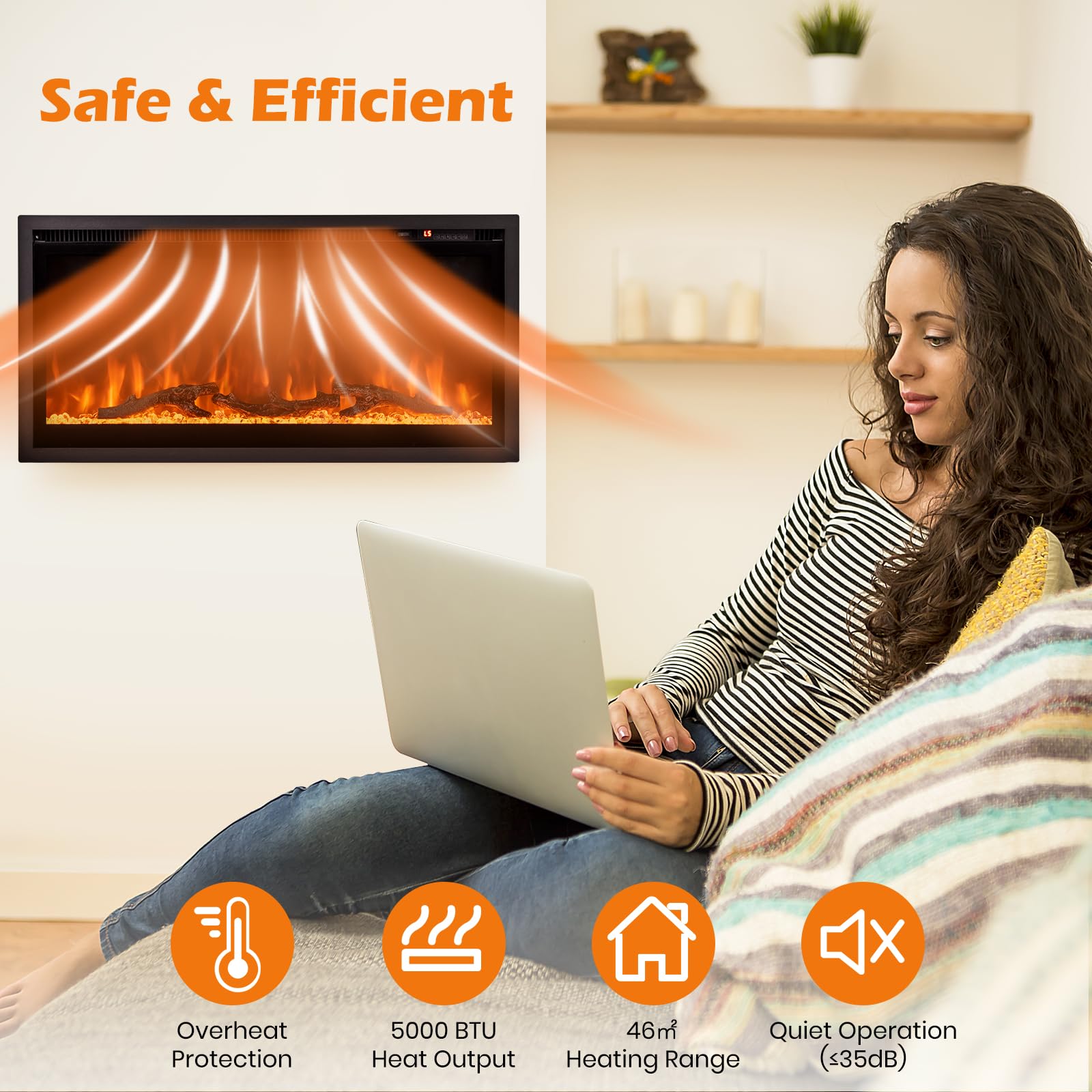 Safe and Efficient Fireplace: With overheat protection and UKCA certification, the fireplace is safe and reliable to use. And it not only heats with high efficiency but also features quiet operation (≤35dB), creating a perfect relaxing environment.