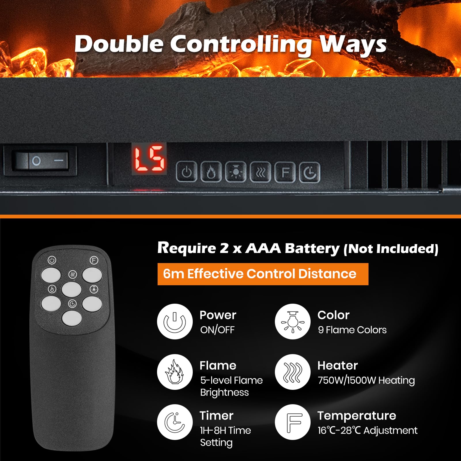 Double Controlling Ways: Both the panel and remote control make the operation much easier. You can easily choose among 9 flame colors, 5-level flame brightness, 750W/1500W heating, 16℃-28℃ adjustment and 1H-8H time setting. Plus, the remote control boasts a 6m effective control distance and requires 2 x AAA batteries (not included).