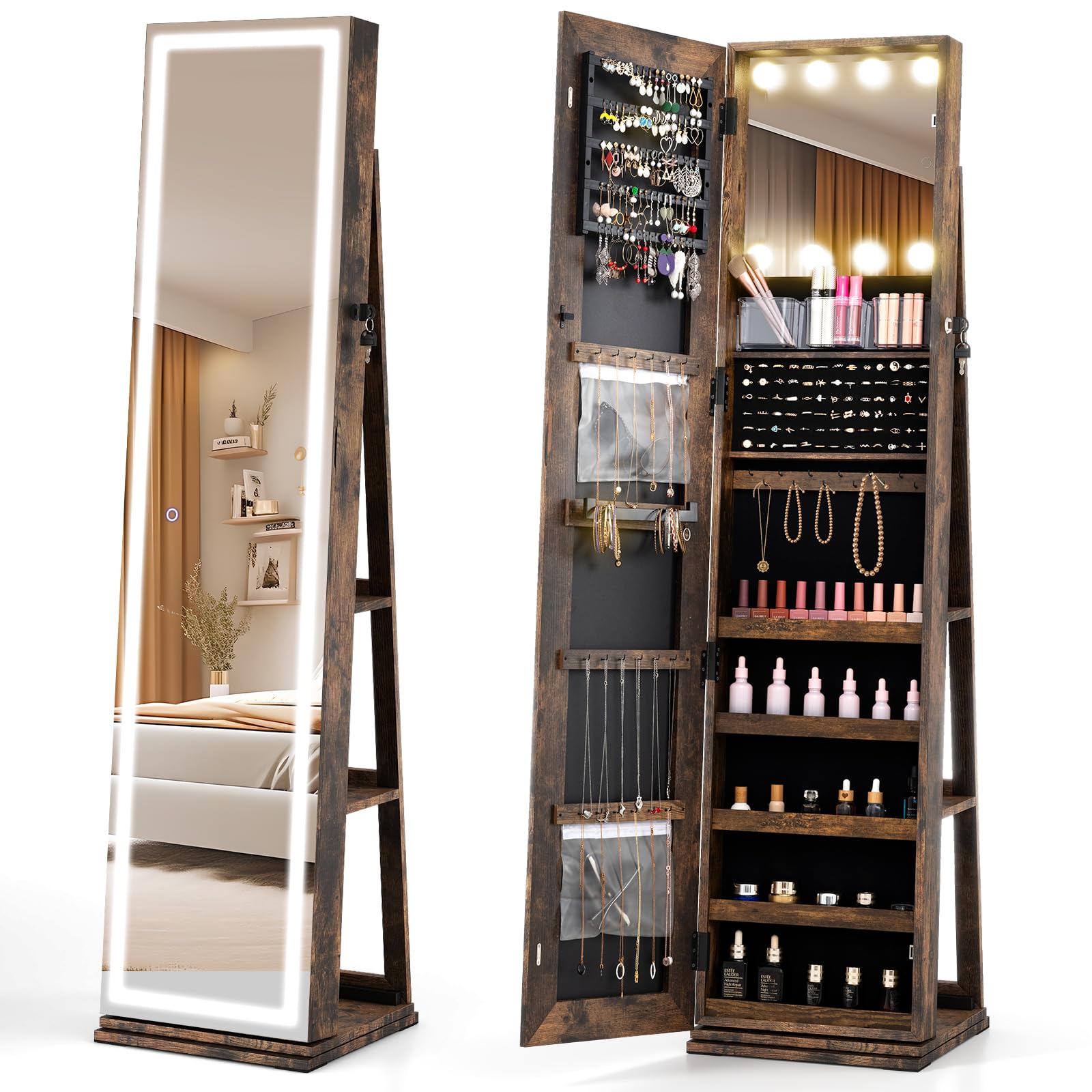 2 Lighted Mirrors with Separate Controls: The full length mirror and interior makeup mirror are equipped with LED lights for optimal illumination, allowing you to better dress up or make up. The touch control enables you to adjust the light color(warm yellow, warm white, cool white) and brightness(30%-100%).