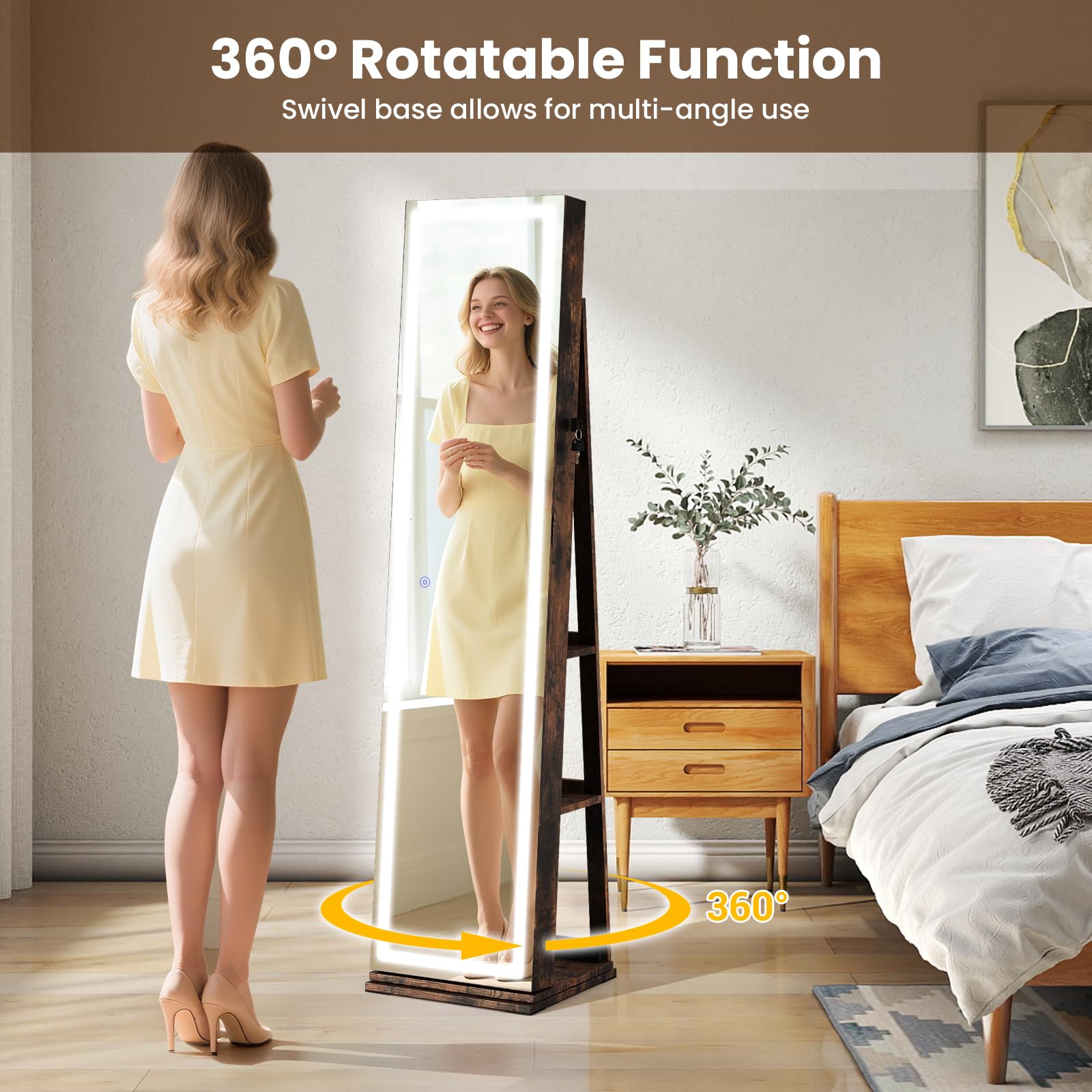 360° Rotatable Function: The 360-degree swivel base allows for multi-angle use. You can effortlessly rotate the jewelry cabinet to find the most suitable angle for enjoying your beauty or reaching for what you need.
