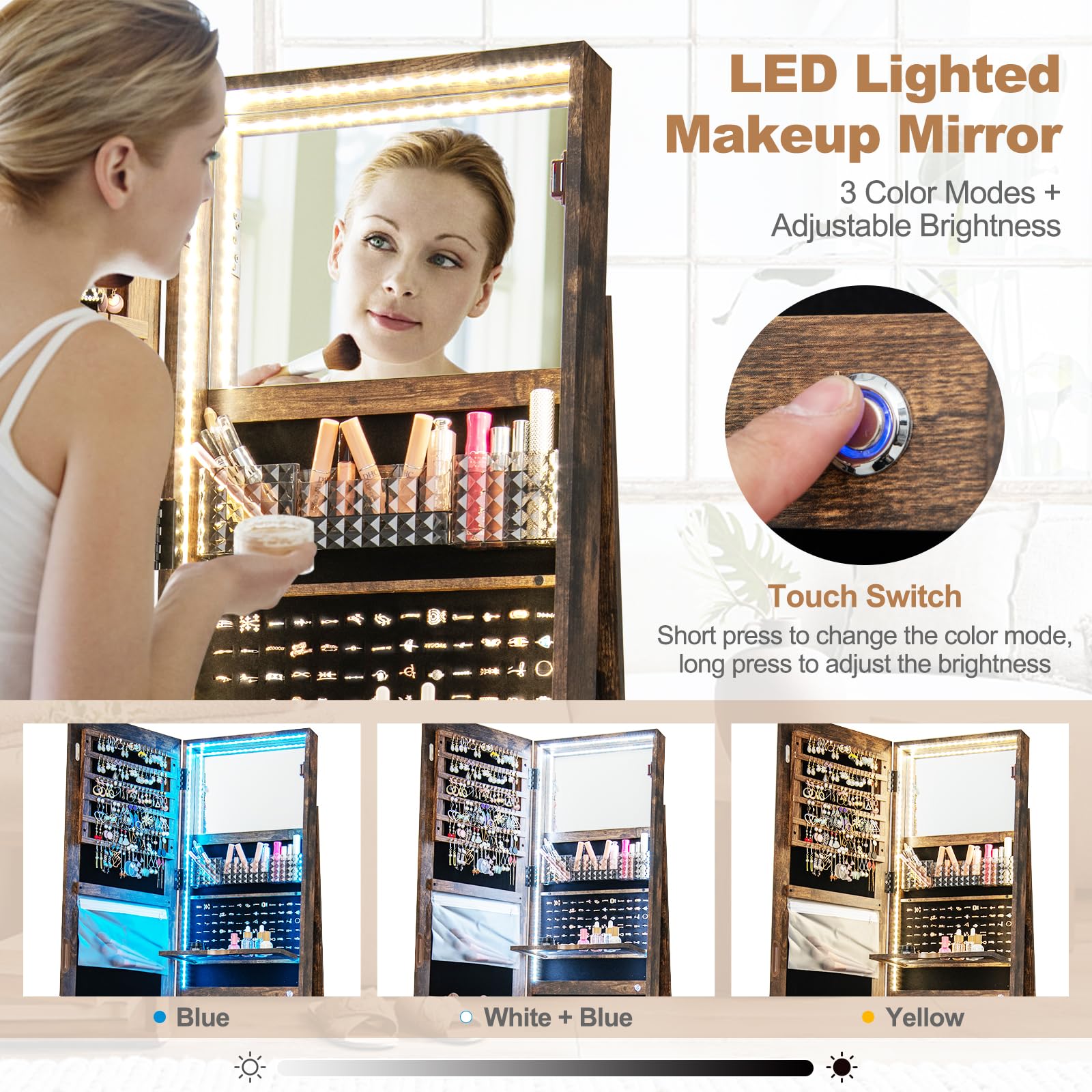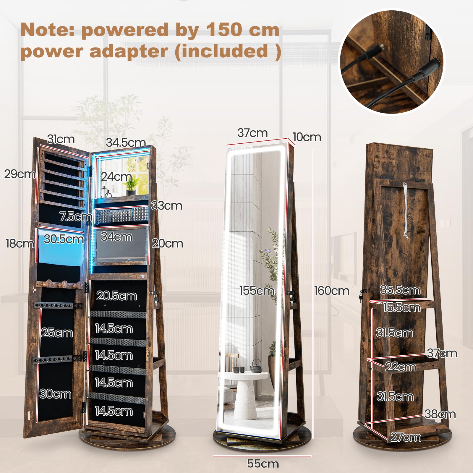 This standing jewelry organizer comes with large and classified storage space. From earrings and necklaces to bracelets and rings, everything can be neatly displayed and easily accessible. The outside of the jewelry cabinet boasts a full-length mirror, while the inside features a makeup mirror. What's more, there are 3-color LED lights surrounded by both mirrors, which are powered by 150 cm power adapter (included). Adjustable brightness meets personal requirements. To ensure the security of your valuable belongings, the jewelry cabinet is lockable. Besides, thanks to the flexible 360° swivel design, you can take items you've stored backside the jewelry armoire at any angle.