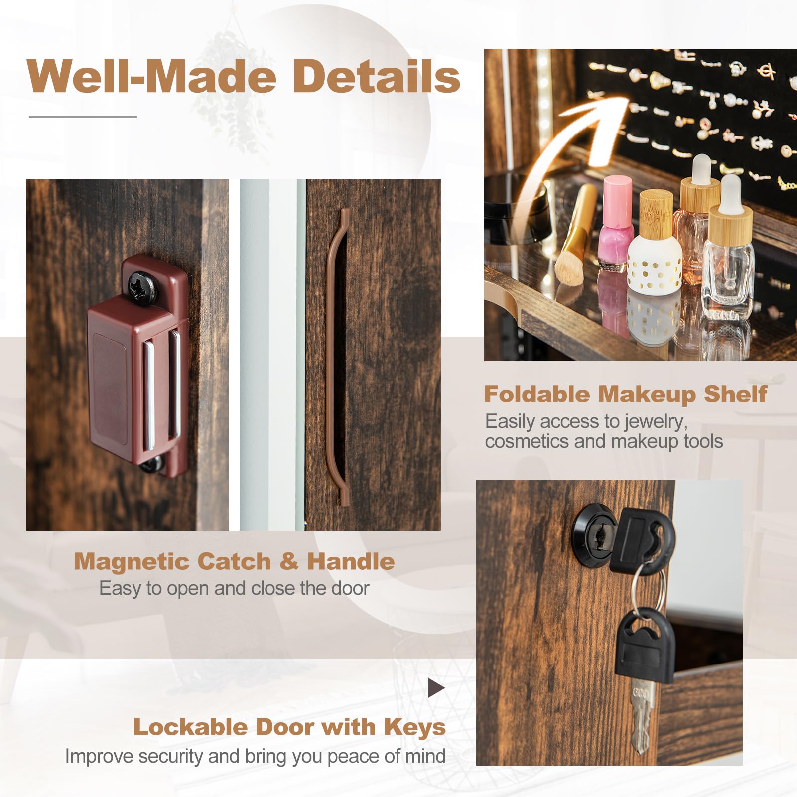 Upgraded Security and Convenience: Equipped with a lockable door with 2 keys, this mirrored jewelry armoire can keep your precious gems and accessories safe. The 360° swivel design allows you to easily fetch items from every angle. In addition, the flip-over makeup shelf adds convenience to your daily makeup routine.