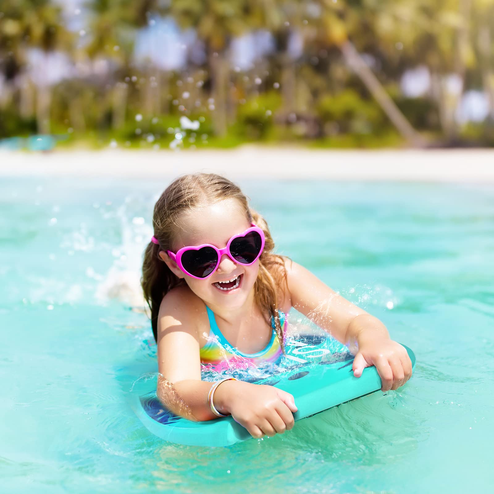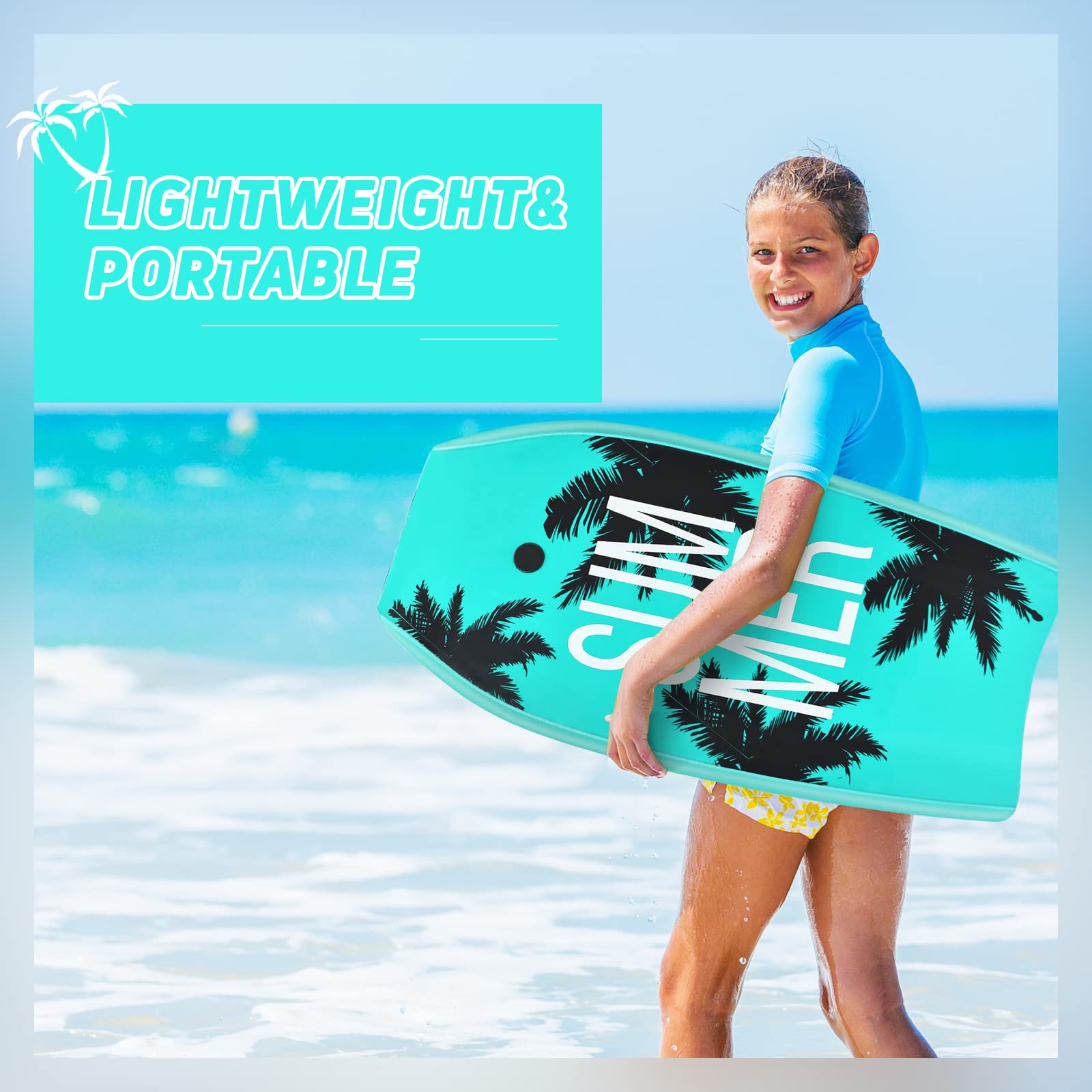 It's a surfboard. This surfboard has a coconut tree pattern, and it is very nice. This surfboard can be used in oceans, beaches and other places. This surfboard is small and light, making it easy to carry. This surfboard is made of floatable XPE and HDPE, so it has good buoyancy. This surfboard is small and suitable for children. The stability of this surfboard is very good. You are very safe using this surfboard. What a nice surfboard!