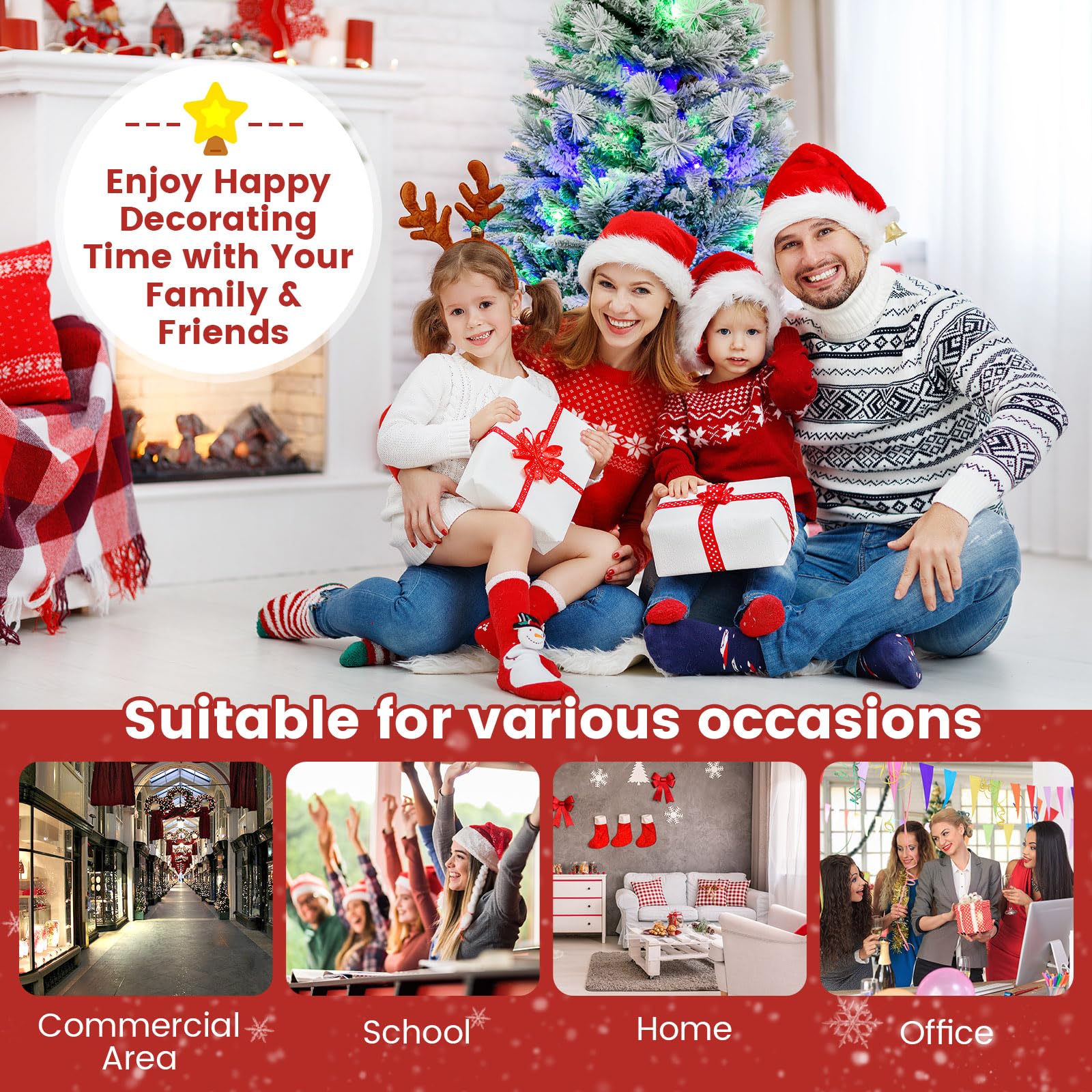 With 472 flocked branch tips and 26 delicate pinecones, it creates an astonishingly lifelike rendition of a winter wonderland. As darkness descends, the Xmas tree comes alive with up to 160 energy-saving LED lights, offering a dazzling array of 4 vibrant colours and 8 dynamic modes (in waves, sequential, slow fade, etc) that will captivate your guests, effortlessly switch between modes with the convenient adaptor button. Crafted from a blend of premium PE and PVC materials, this Xmas tree stands strong and is fireproof, non-allergic and smell-free, ensuring safety and durability for years to come. The innovative hinged structure allows for easy setup, as the premium mixed branch tips automatically expand, the sturdy metal stand unfolds effortlessly. We even provide a pair of gloves for your protection. Versatile and imbued with the spirit of the season, this Christmas tree is a joyous symbol of happiness, perfect for any setting. When the festivities wind down, effortlessly disassemble it into 2 sections for convenient storage until the next magical holiday season. If you are looking for a Christmas tree like this, do not hesitate to place an order!