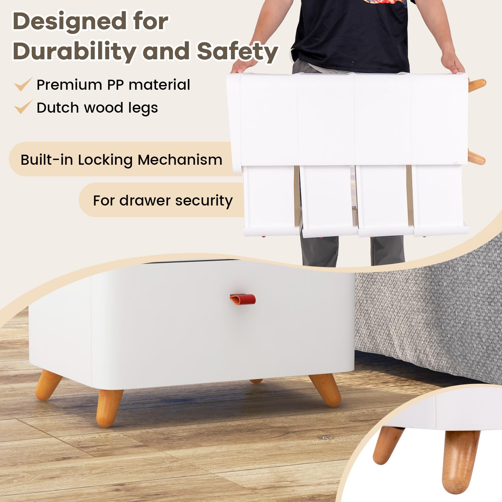 Designed for Durability and Safety: Crafted from premium PP material and solid wood legs, our dresser chest ensures a sturdy structure with a strong weight capacity. It also includes a built-in locking mechanism for drawer security and rounded corners to reduce injury risks.