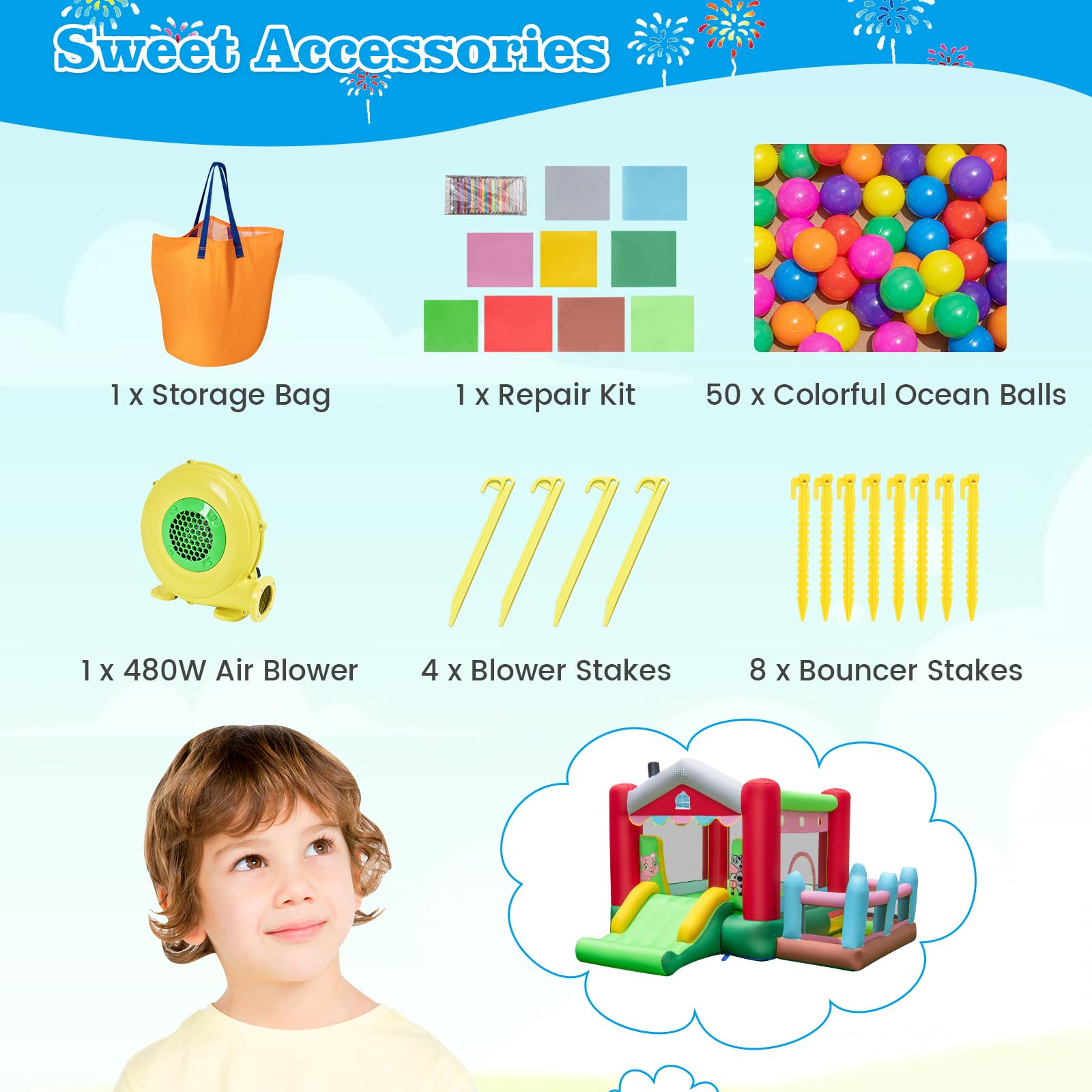 Sweet Accessories: In addition to the ocean balls and blower, the kids bouncer is completed with a handy storage bag, a repair kit for any mishaps, and sturdy ground stakes for a secure setup. It is a great gift choice for children’s birthday or Christmas.