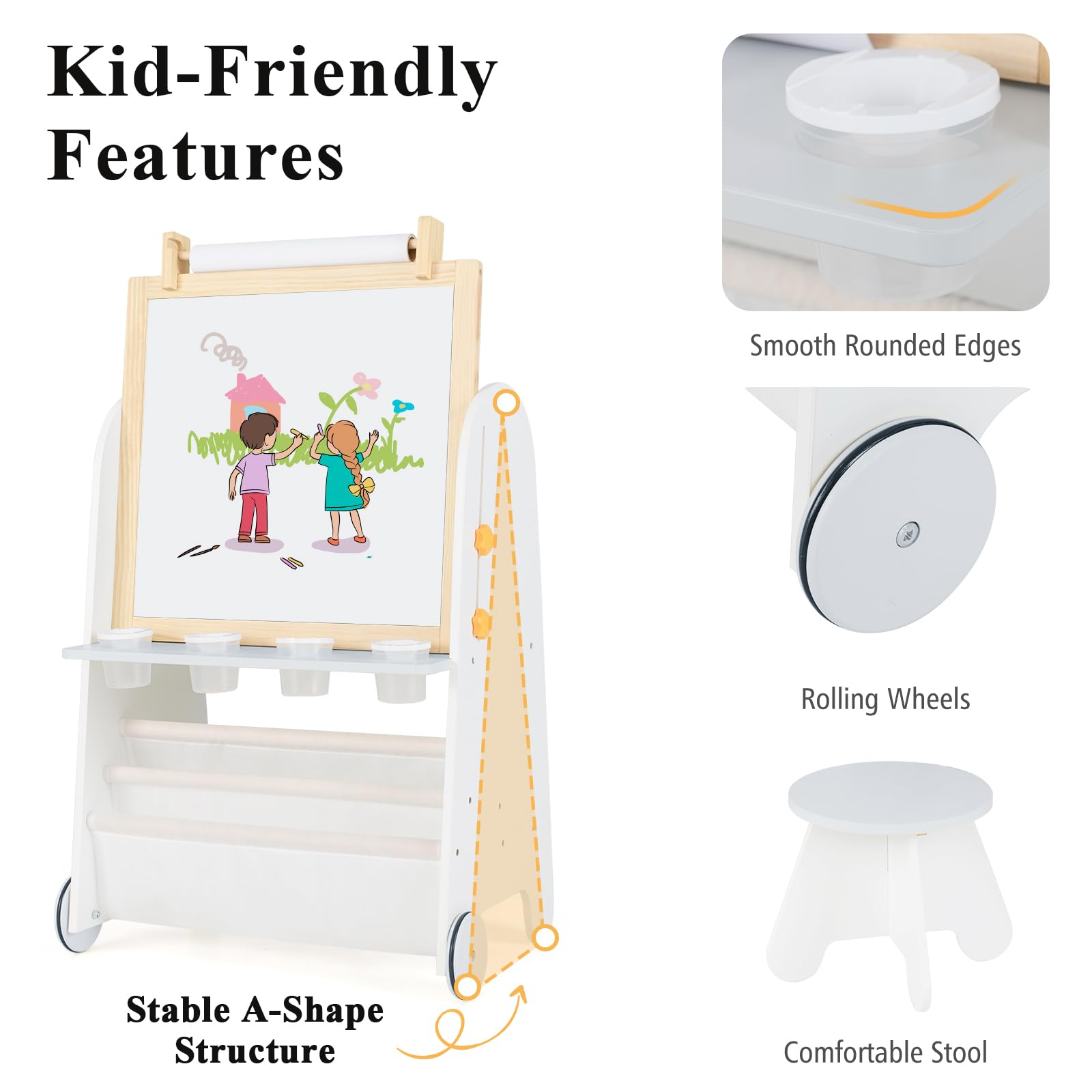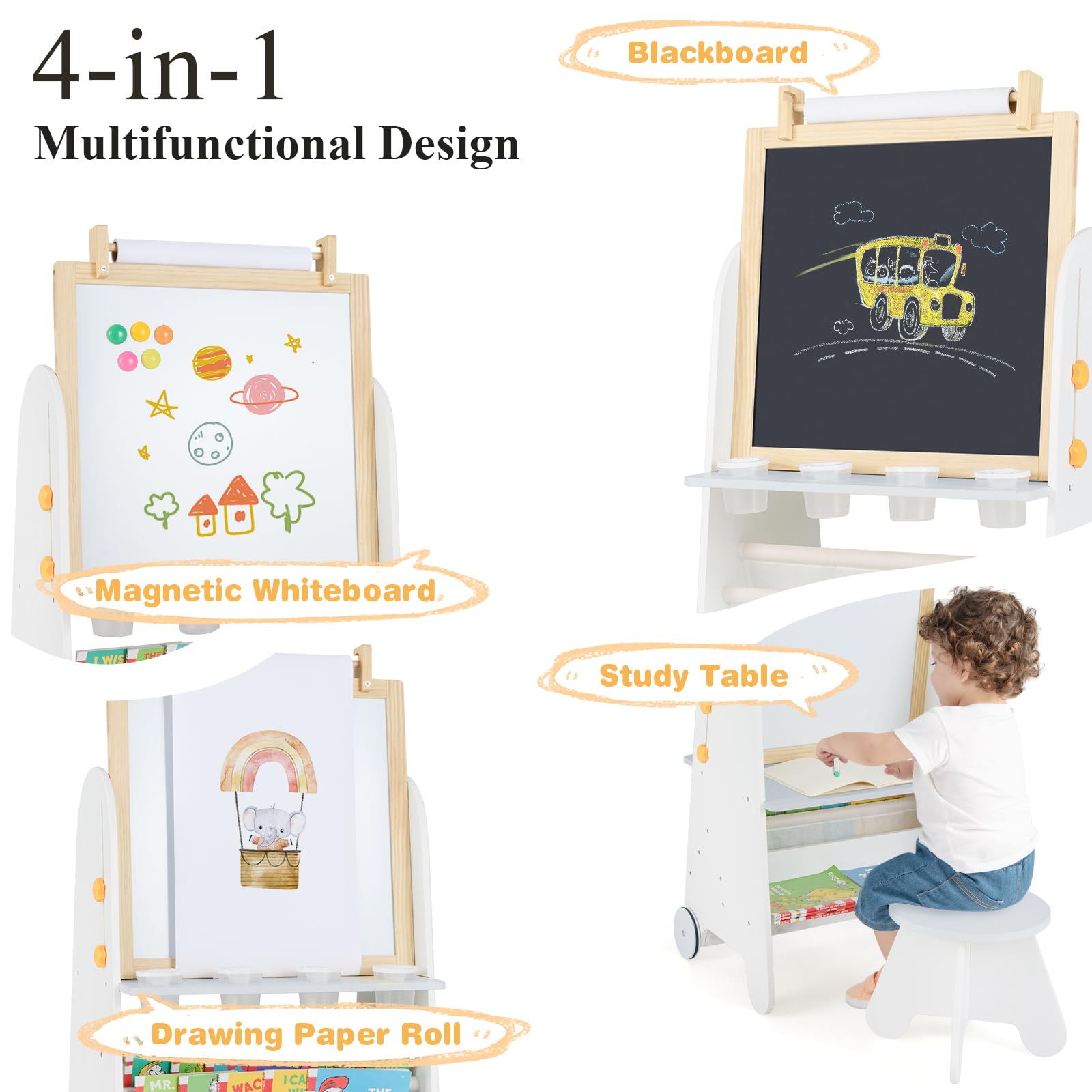 4-in-1 Multifunctional Design: This innovative setup includes a double-sided art easel—magnetic whiteboard on one side and blackboard on the other—along with a drawing paper roll and a study table. Easel dimension: 42 cm x 56 cm x 92-105 cm (L x W x H). Seat dimension: 28 cm x 25 cm (Dia x H).