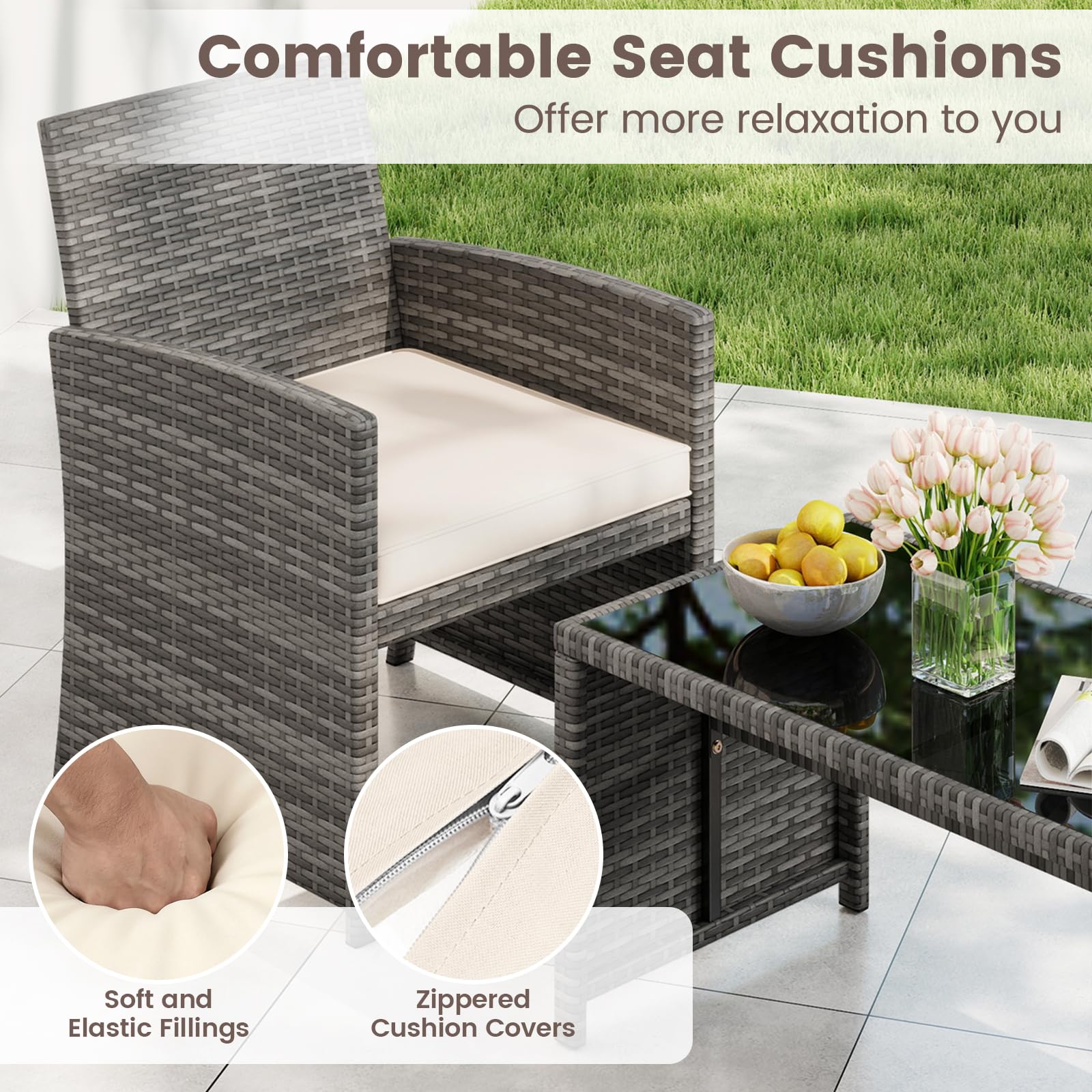 Ergonomic & Cushioned Seating: Both the loveseat and single chairs of the patio set boast ergonomic backrests and curved armrests to support a natural sitting posture. The included cushions with soft and elastic fillings offer enhanced comfort, which are also simple to clean with zippered cushion covers.