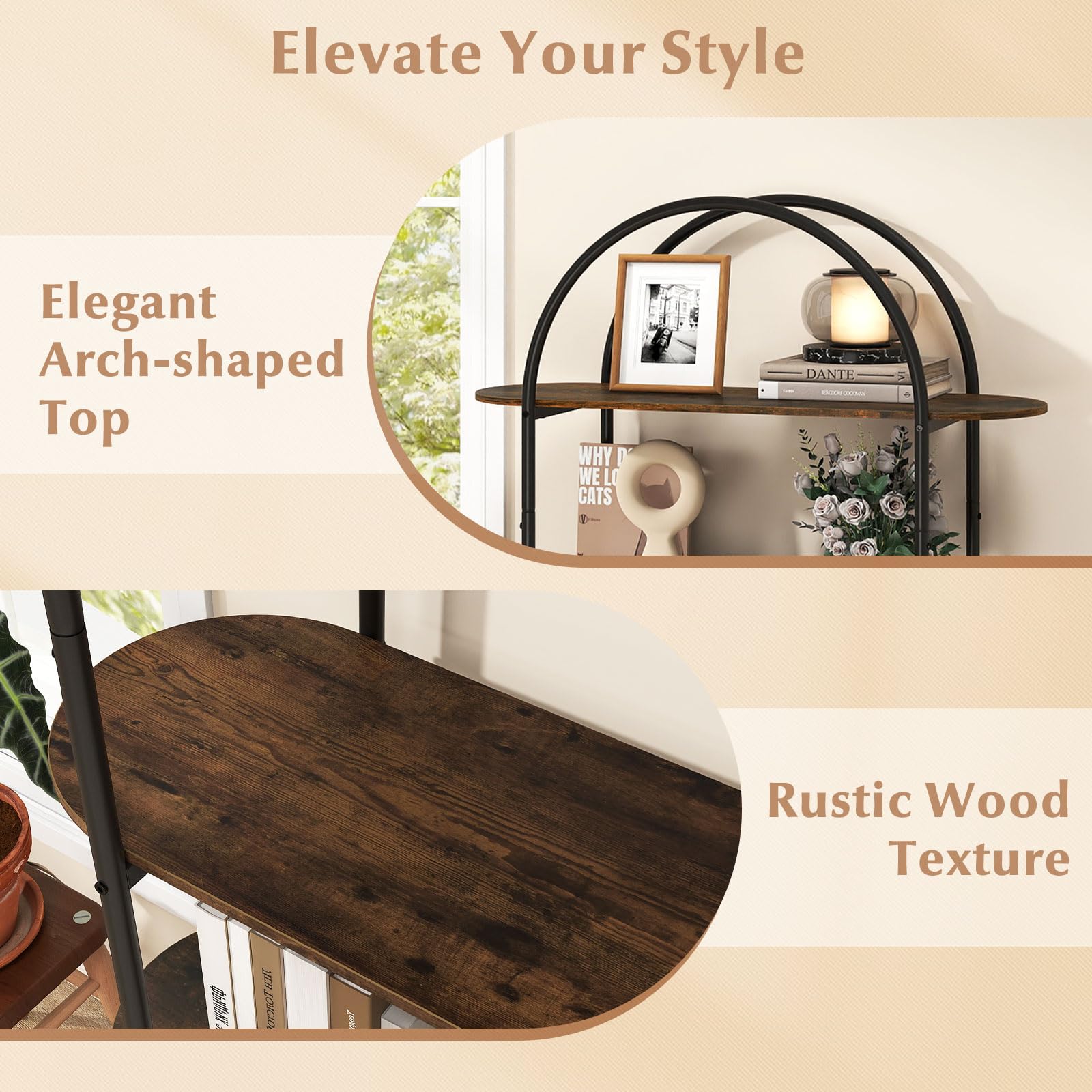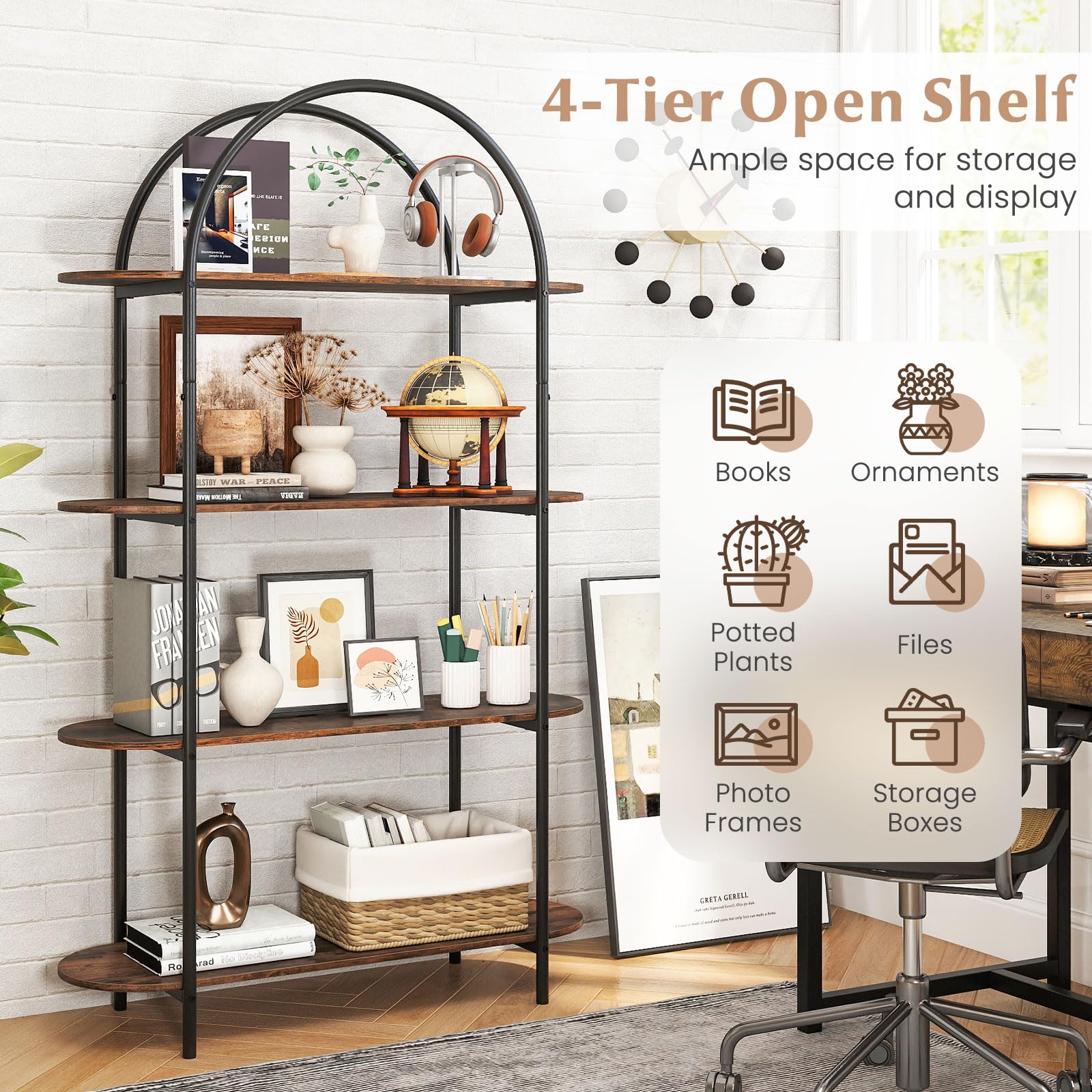 This arched bookcase brings a sophisticated and graceful touch with its rustic brown and black/gold and white colors, adding an industrial/a modern vibe to your room. The sturdy metal frame and reinforced crossbars ensure stable and reliable support for your items. Featuring 4 spacious tiers, this freestanding shelving unit allows easy organization and quick access with its open display shelf design. For added safety, it includes 2 anti-toppling devices that secure the unit and provide peace of mind in busy households.