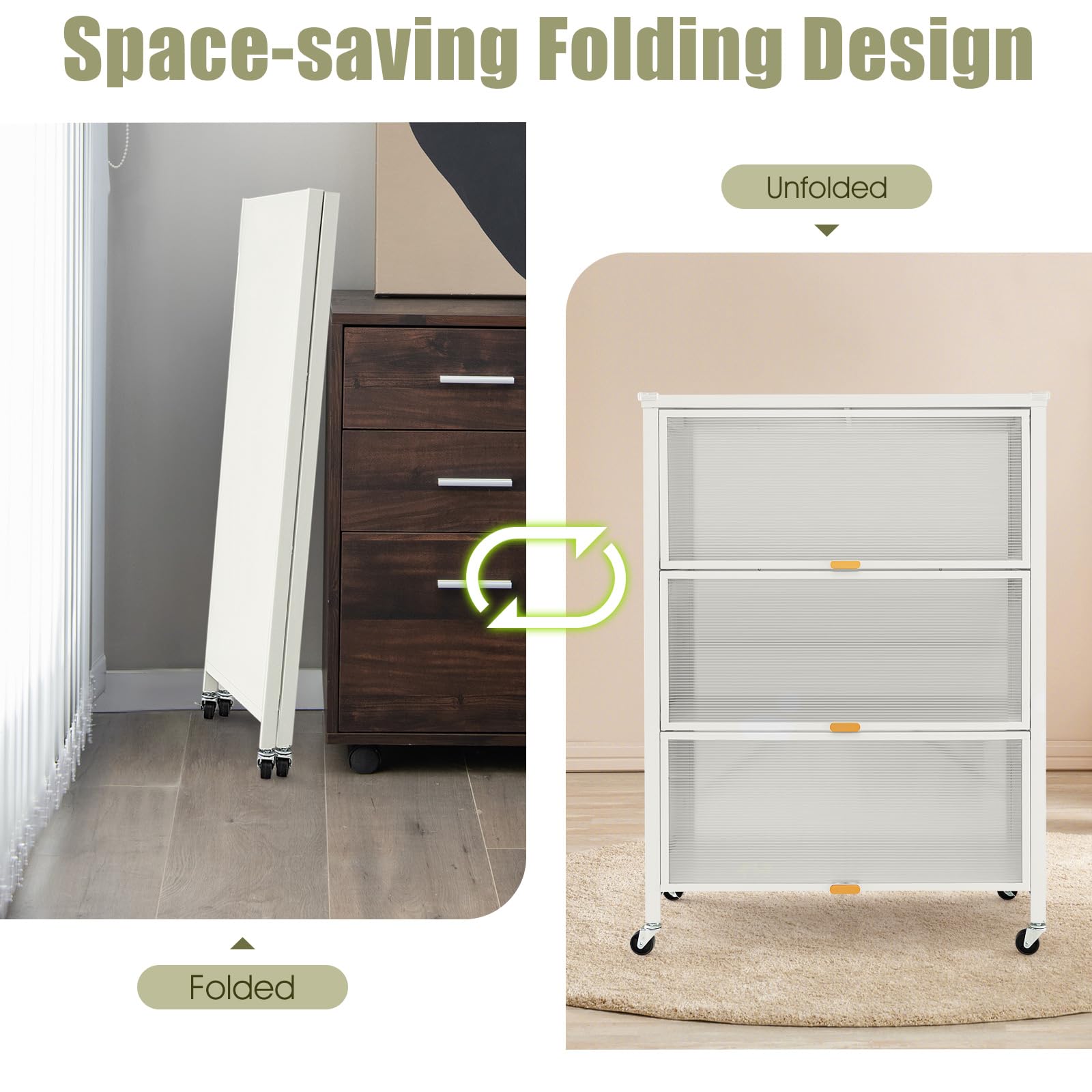 The rack provides a spacious countertop and 3 shelves for multiple items, while the transparent and flip-up PC doors offer visibility and keep out dirt. Its durable and rustproof metal construction supports heavy weight, enhanced with safety features like corner protectors and the anti-toppling device. Mobility is assured with 4 wheels, 2 of which are lockable. Furthermore, the main frame can be folded into a compact size with only 6cm thickness, which save both effort and space. All in all, this kitchen rack is a perfect blend of functionality, durability and smart design.