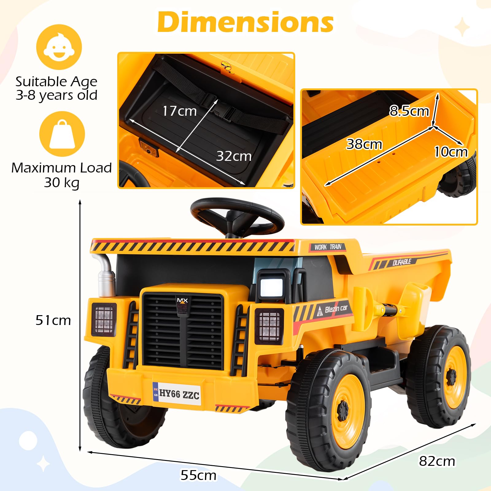 Interactive Dump Bed: Featuring a dump bed that tilts at the press of a button, this ride on truck encourages imaginative play. The dump feature allows kids to load and unload materials with the shovel included, turning every ride into a mini construction adventure.